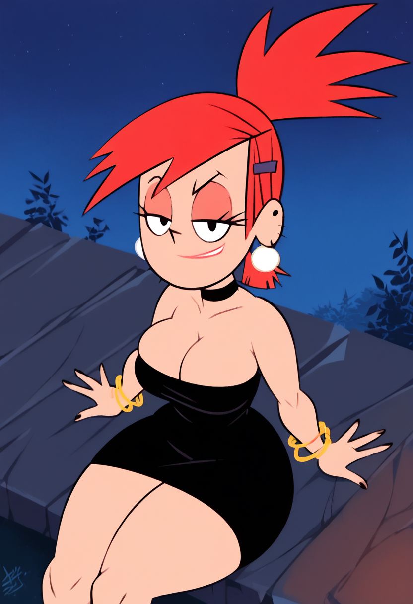 Score_9, Score_8_up, Score_7_up, 1girl, perfect eyes, perfect face, big breasts, big ass, wide hips, thick thighs, cleavage, looking at the viewer, sitting, male POV, seductive smirk, red hair, hairclip, ponytail, toned, FrankieFoster, makeup, black dress, glitter dress, outdoors, night time, pearl earrings, gold bracelets, jewelry
