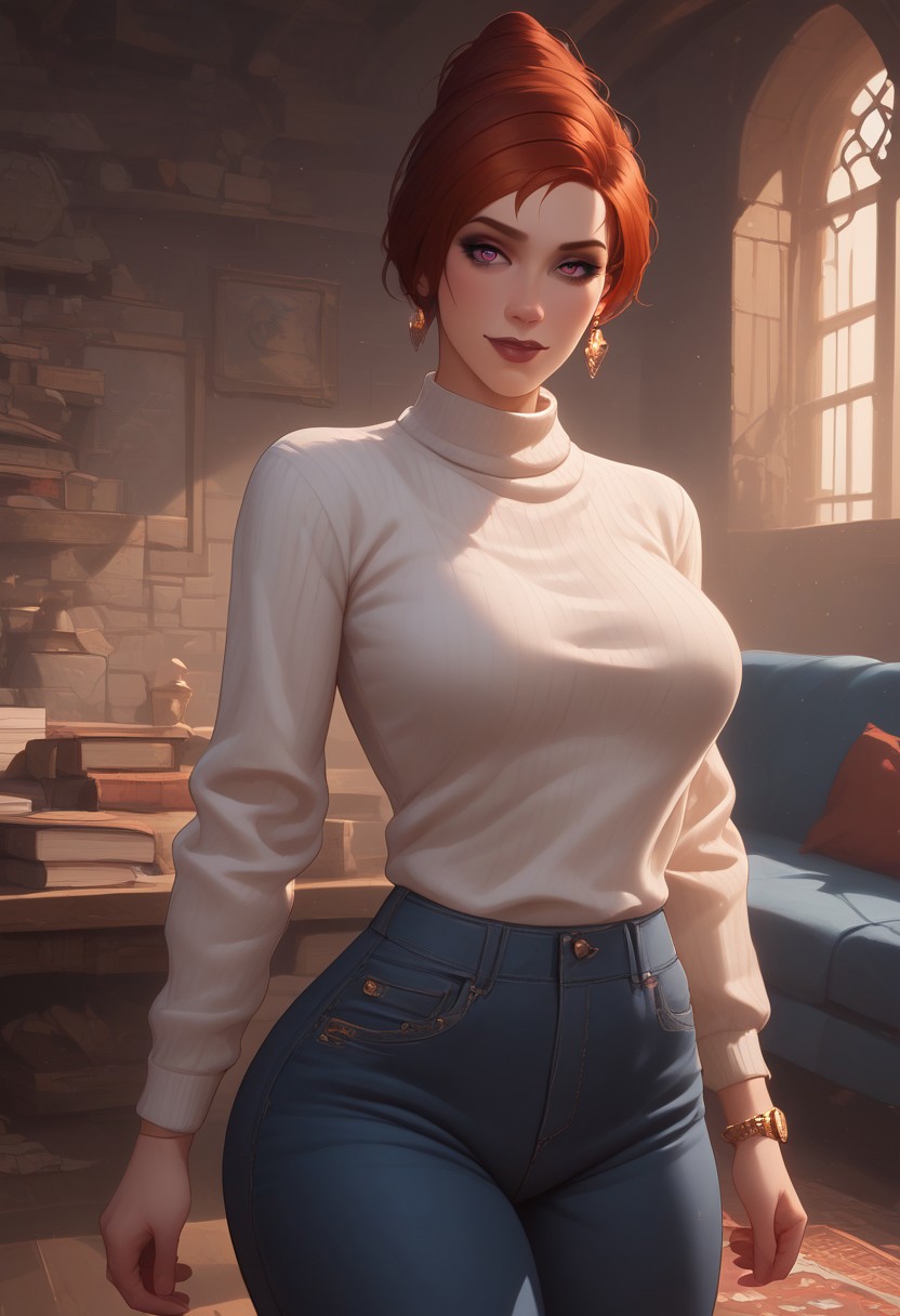 Assumi posing, View focus on Assumi, 1girl, solo, Assumi, pink eyes, eyecontact, looking at viewer, black eyeliner, dark red lipstick, red jewelry earrings, heart shaped earrings, red hair, short hair, single hair bun, curvy, large breasts, big ass, closed mouth, subtle smile, neutral face, turtleneck pullover, long sleeves pullover, denim pants, fishnet, watch, satin scarf, cleavage, dynamic pose, Living room, couch, chimney, fire pit, book, Evening, natural lighting, warm lighting, Masterpiece quality, high definition, detailed face, Expressiveh, EnD_CGI Style, Style-Volumetric, score_9, score_8_up, score_7_up, score_6_up, score_5_up, score_4_up, uncensored, BREAK