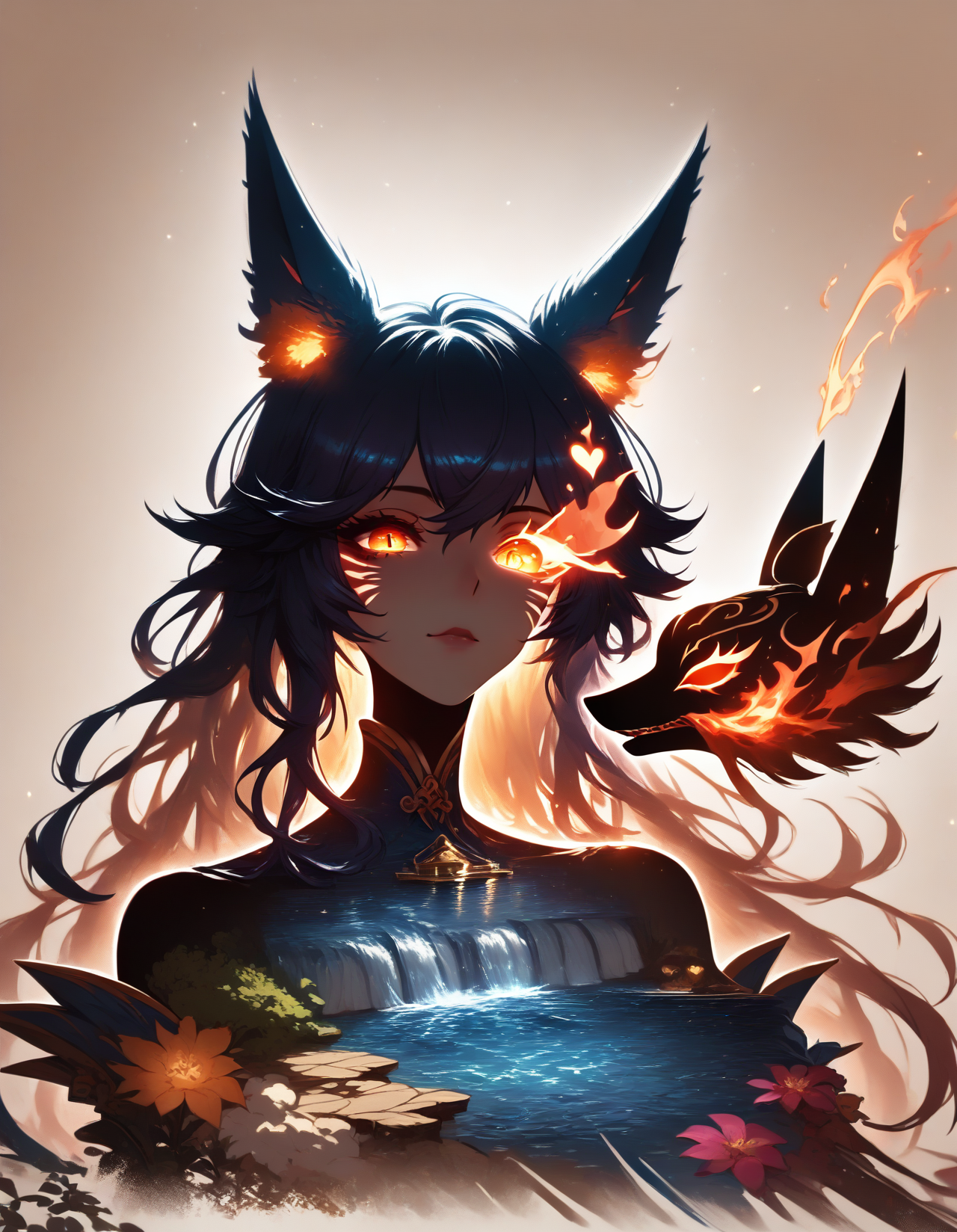 score_9, score_8_up, score_7_up, 1girl, black outline (Silhouette) of (ahri:.9) from \(league_of_legends\) casting a double exposure of Vastaya cityscape, beautiful face, wrnchexpwhimsicalvisions, black outline, silhouette, rainbow flaming eye, rainbow eye trail, (holding fox mask), multiple tails, closeup, portrait, visible cardiovascular system, visible heart, inkshadow, minimalist, domineering expression, Sideyeing viewer