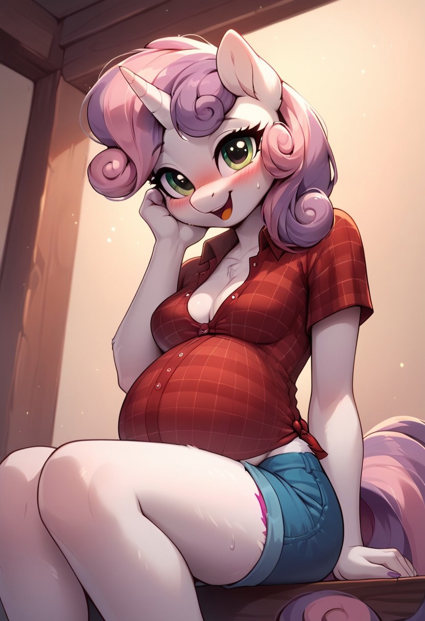 score_9, score_8_up, score_7_up, score_6_up, score_5_up, score_4_up, source_pony, ((anthro Sweetie Belle, petite body, happy and satisfied)) medium perfect round breasts, cute face, sexy legs, long legs, hooves, hands, blushing, beautiful, tail growing from the tailbone, blush, looking at viewer, low angle, 1 girl, fur,furry,mammal, blush, sweating on body, tail growing from tail bone, cleavage, pregnant, sitting, stomach focus, red plaid shirt, blue short shorts