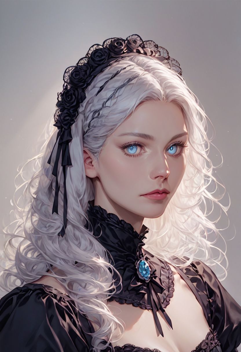 score_9, score_8_up, score_7_up, low light, softly lit parlor, portrait, 1 woman, classical pose, demure expression, cunning, long straight platinum hair, narrow long face, light blue eyes, black lace victorian attire, black velvet romantic era attire, pinched features, victorian gothic setting, facing the camera, realistic