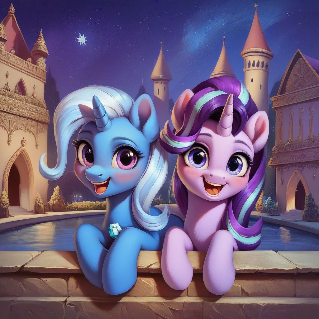 score_9, score_8_up, score_7_up, score_6_up, duo, pony, starlight glimmer, trixie, palace, happy, look at you, night, blushing, detailed, cute