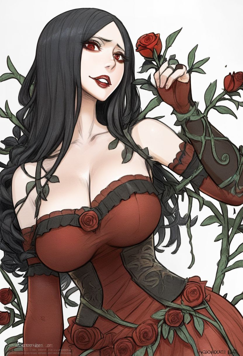 kdmstyle, flat color, 1girl, solo, bangs, smile, makeup, lipstick, lips, teeth, jewelry, breasts, cleavage, collarbone, upper body, black hair, long hair, red eyes, parted bangs, hair flower, parted lips, bare shoulders, large breasts, plant, leaf, rose, vines, flower, red rose, red flower, ivy, frills, clenched hand, black rose, elbow gloves, looking at viewer, strapless, dress, detached sleeves, gloves, silk, strapless dress, red dress, red lips, bridal gauntlets, eyebrows visible through hair, lace, hand up