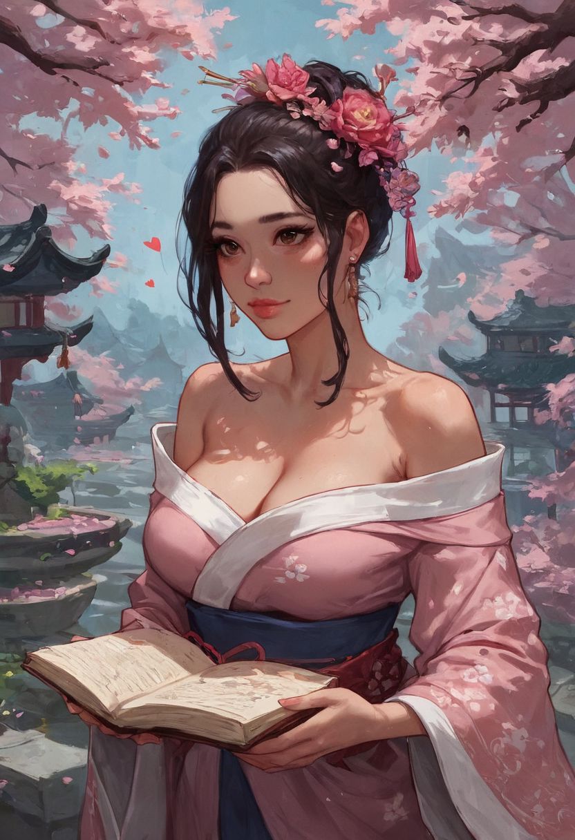score_9, score_8_up, score_7_up, score_6_up, score_5_up, score_4_up, sexy asian girl, 1girl, A 20-year-old Japanese princess stood poised in a royal garden, her big brown eyes filled with a mix of innocence and allure. Her nihongami hairstyle framed her delicate face, and she wore a blue floral kimono, tastefully off-shoulder, revealing just enough to be alluring. In her hands, she held a glowing magic book, its pages casting a soft, mystical light. Surrounded by bonsai trees and sakura blossoms, the warm light bathed the scene in ethereal beauty. Hearts fluttered around her, enhancing the romantic and enchanting atmosphere of her seductive pose.