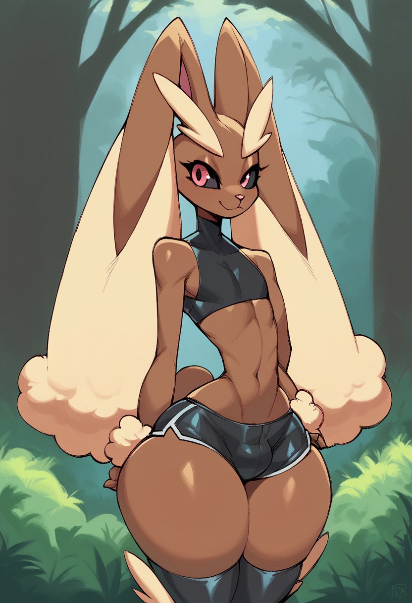 score_9, score_8, score_7, 1boy, femboy, flat chest, solo, exposed stomach, thin waist, big ass, lopunny, croptop, thigh highs, forest, shorts