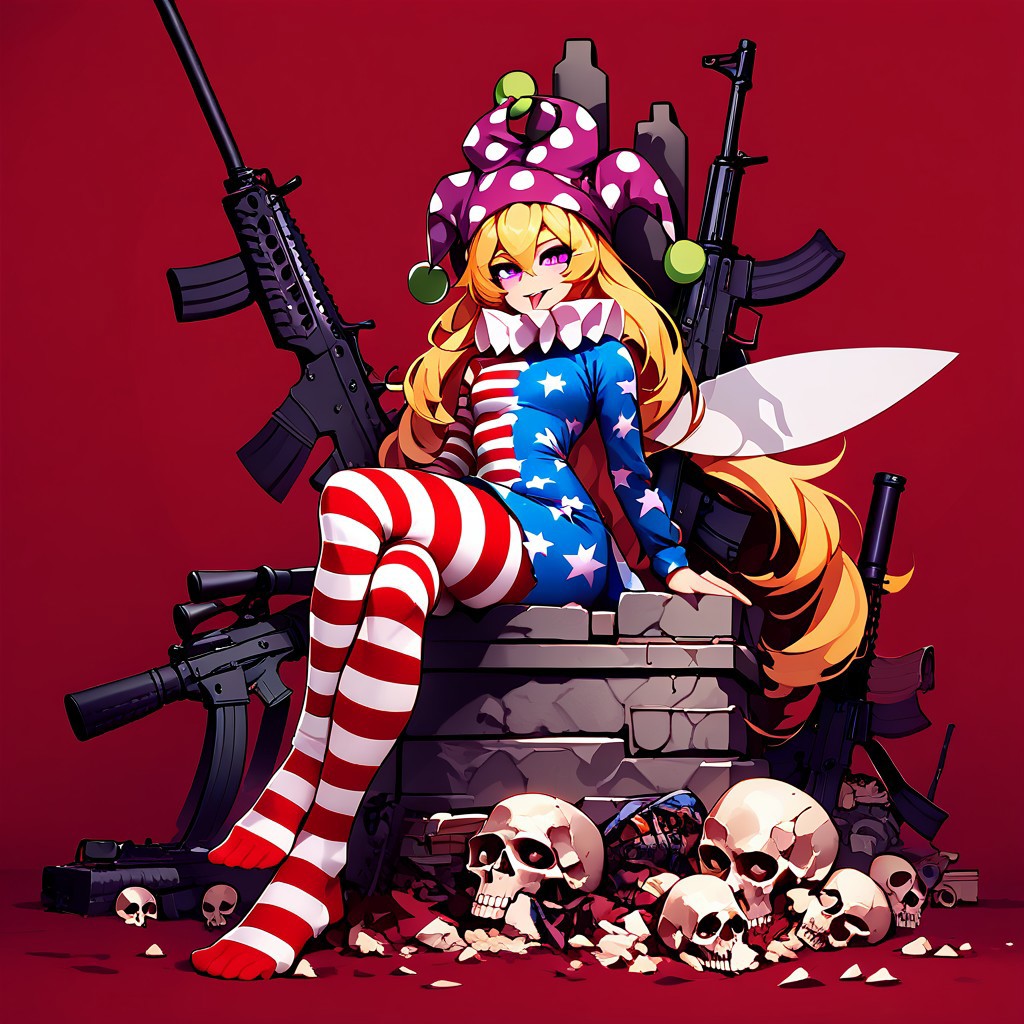 score_9, score_8_up, score_8, medium breasts, (curvy), zzClwnpc, looking at viewer, long sleeves, hat, dress, hair between eyes, sitting, very long hair, purple eyes, full body, weapon, pantyhose, wings, tongue, striped, tongue out, pink eyes, star (symbol), gun, no shoes, crossed legs, polka dot, red background, rifle, skull, fairy wings, assault rifle, star print, jester cap, machine gun, american flag legwear, american flag, american flag dress, neck ruff, m4 carbine, kalashnikov rifle, guns, throne, zPDXL, Expressiveh