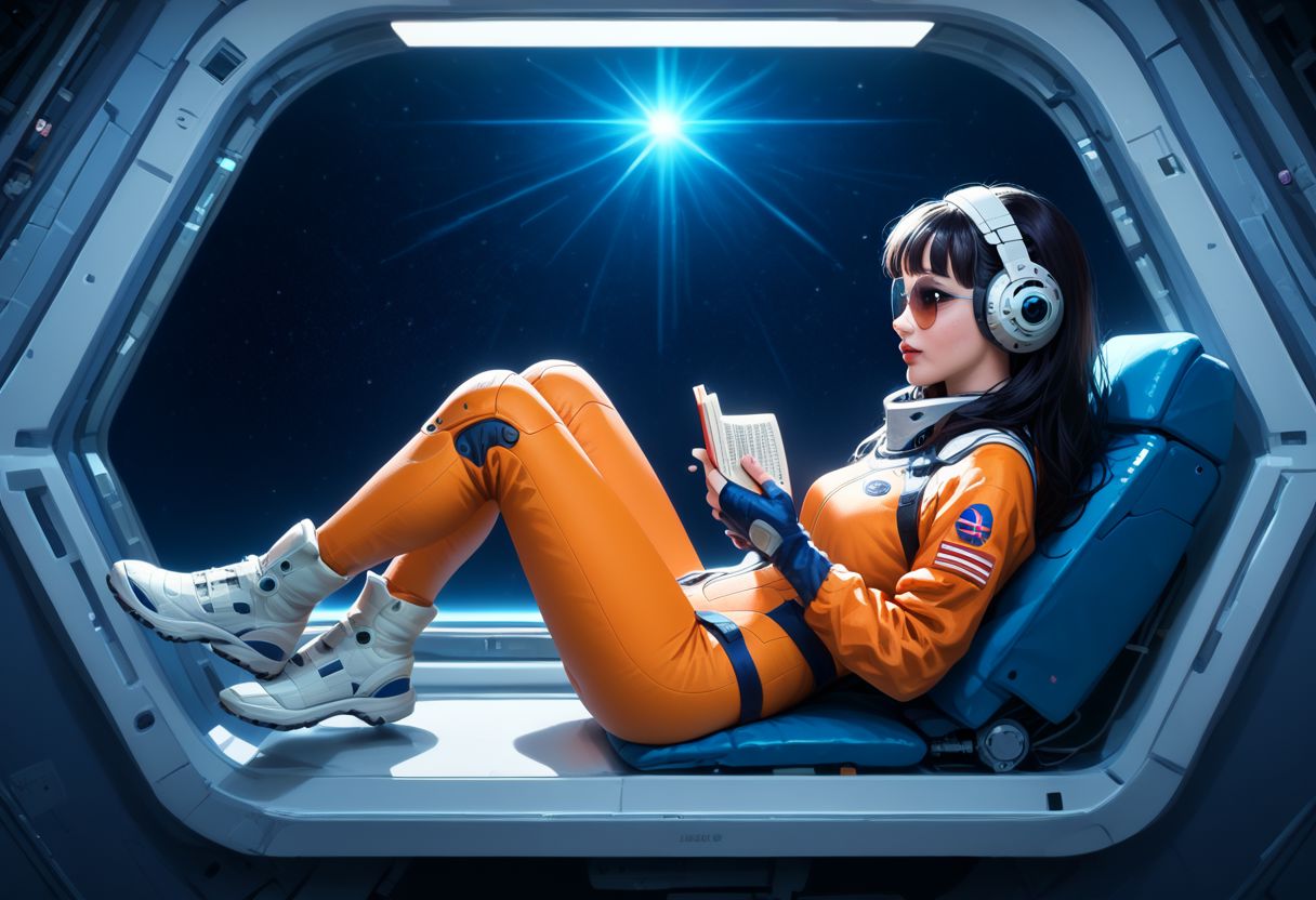 score_9, score_8_up, score_7_up, 1girl, solo, Full body of kawakami_tomie, (mole_under_eye:0.75), long_hair, blunt_bangs, tinted glasses, pleasurable look on face, (side profile facing right), (wearing a blue and orange space suit with no helmet), in pilot seating on the command deck interior of 1980's science fiction spaceship, graphic novel flat colors style, cropped detail, fine intricate lineart, hatched shadows, amazing textures, sharp focus, reading a pilot's manual, (inside 1980's science fiction spaceship interior)