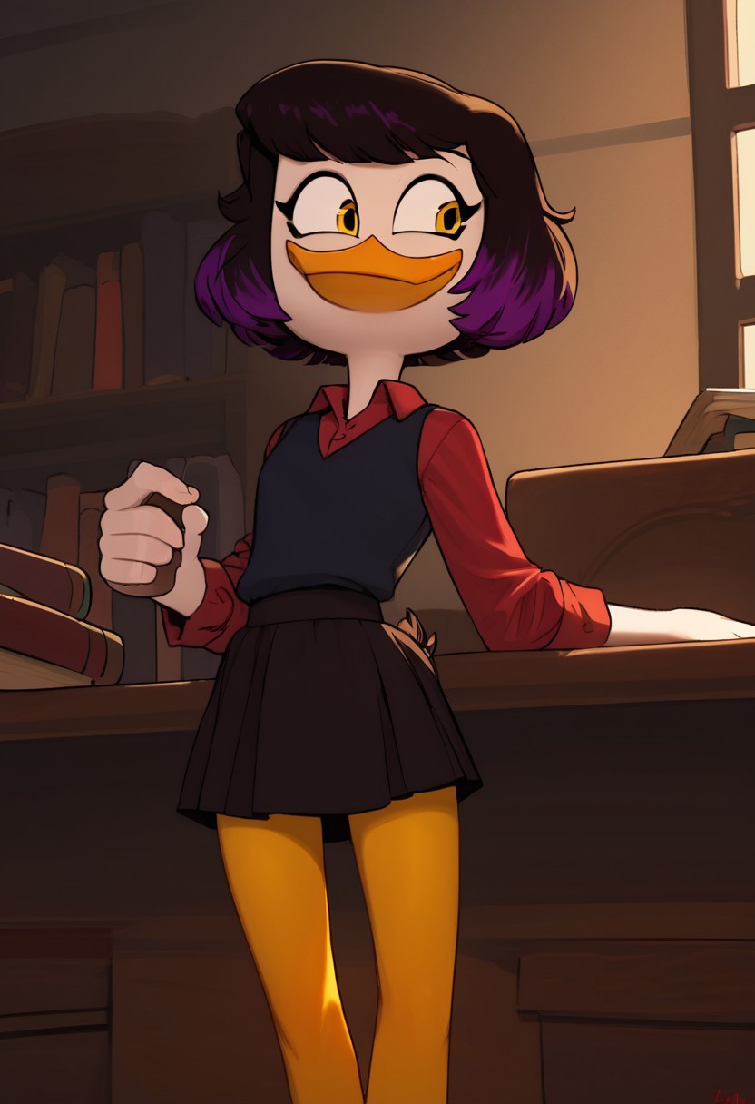 score_9, score_8_up, score_7_up, hi res image, source BREAK ducktales, duck, beak, scut tail, white skin, short hair, eyeliner, orange legs, webbed feet, yellow eyes, black vest, maroon dress shirt, long sleeves, short sleeves, black skirt, curly hair, black hair, bright purple highlights, smiling, happy, standing BREAK In a library