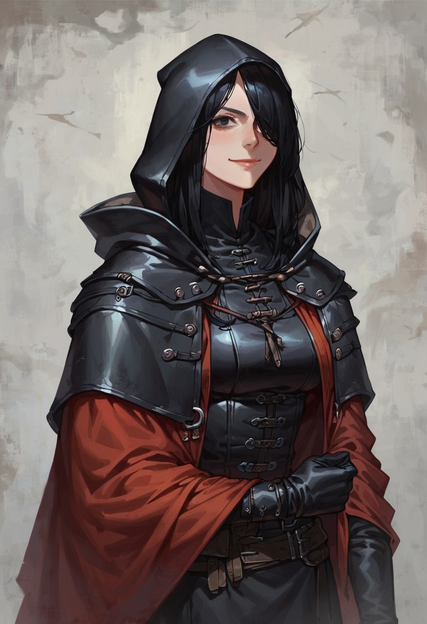 score_9, score_8_up, score_7_up, 1girl, solo, long hair, black hair, black eyes, short stature, big eyes and ears, hair over one eye, smirk, closed mouth, black hooded cloak, hood over face, black leather gloves, leather garments, medieval, dungeons and dragons, semi realistic, cowboy shot, looking at viewer, halfling,