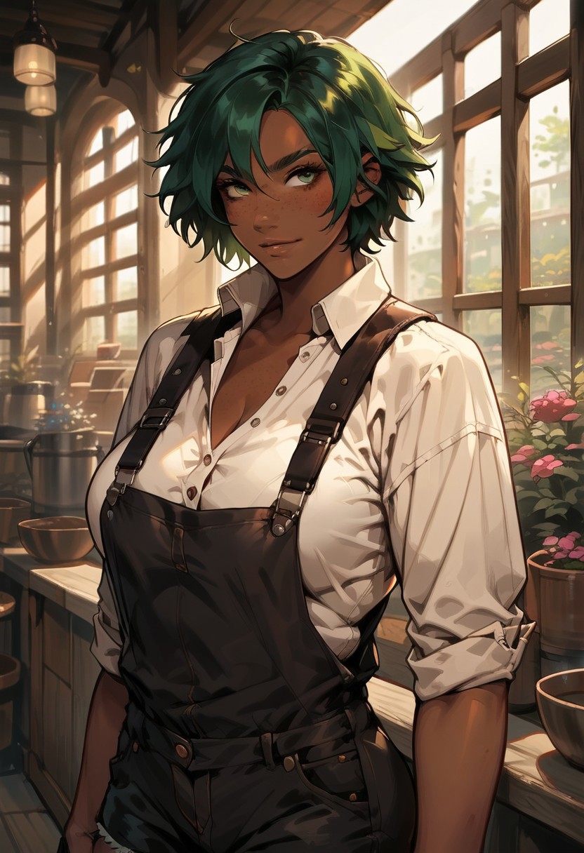 score_9, score_8_up, score_7_up, score_6_up, 1girl, solo, source_cartoon, source_western, dramatic, cinematic, raw, photo, focus macro shot, bokeh effect, bashful blash, depth of field, female, gnome, short, brown skin, freckles, mint green hair, uneven bangs, bowl haircut, short hair, round face, chubby, chubby tummy, large breasts, big butt, unbuttoned floral shirt, overalls, cut off booty shorts, looking viewer, smiling, garden, fantasy, tavern