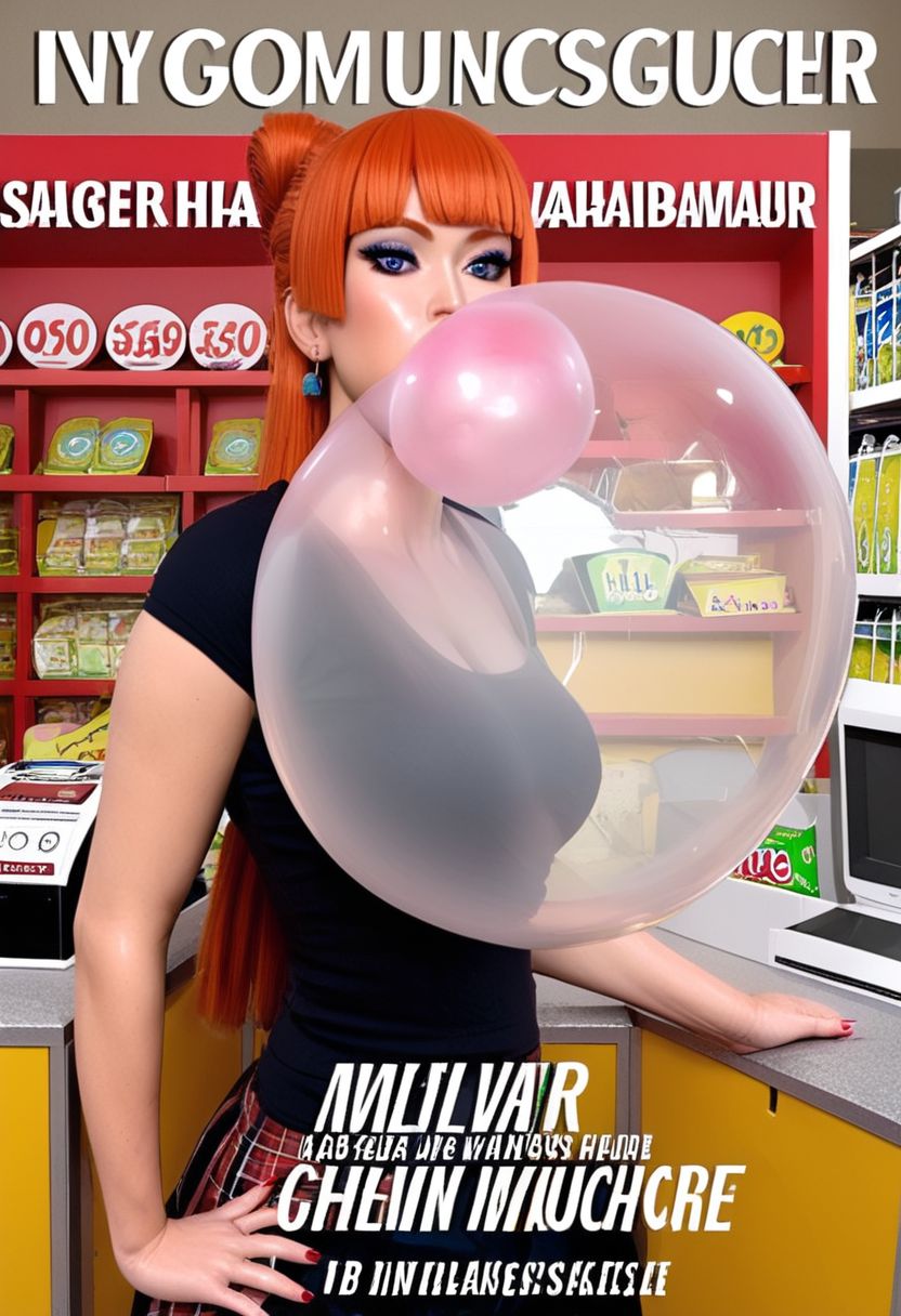 VintageMagStyle, A pulp magazine cover, 1woman, solo, 2000's, facing left shot, Ikea warehouse, large growing Japanese woman nyotengu with long bright ginger and cerise hair behind cash register wearing store clerk clothing, behind the cash register ((blowing largest biggest enormous gigantic transparent bubblegum bubble)) in front of her face the size of the room with pleased look on her face as she's showing off her bubblegum blowing skills with a gigantic bubble in the background filling the store