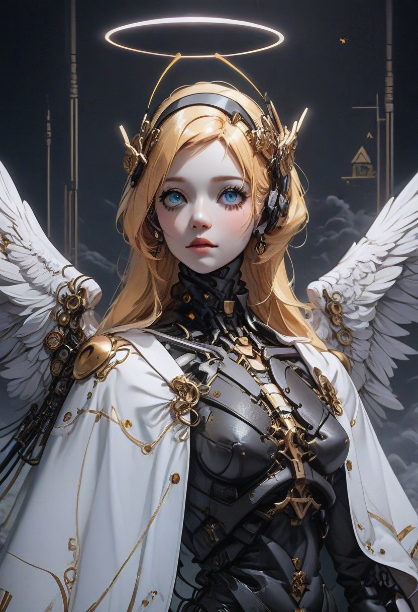 score_9, score_8_up, score_7_up, xenotr1p, (angel), (wings), (white with golden decorations, marble), mcnm, absurdres, (UHD), pure, (halo), holy, golden glow, angelic, Robot Skin, Android Skin, (close up), surrounded by clouds, highly detailed, best quality, masterpiece, digital_art, <lora:Mechanism-pdxl-1:1.0>, composition;(from above, look up)