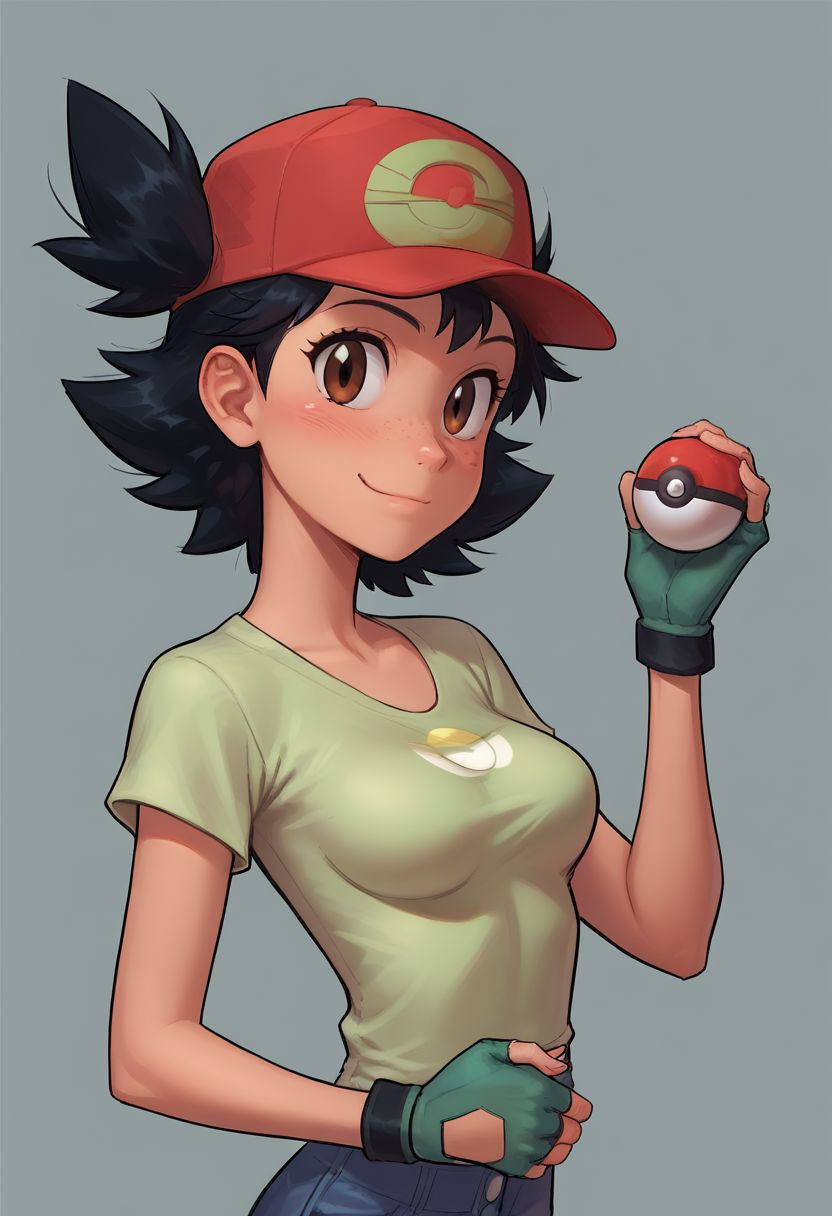 score_9, score_8_up, score_7_up, score_6_up, score_5_up, score_4_up, ash ketchum, female ash, gender swap, pokemon, young face, skinny, turning to face viewer, head tilt, 1girl, portrait, medium breasts, Ash (pokemon) (cosplay), red hat with white front, blue short sleeve jacket, green shirt, green fingerless gloves, one hand holding one Pok Ball, short spiky black hair, brown eyes, blue jeans, looking at viewer, kinky, adorable, petite, skinny, side view, looking at viewer, round face, 18 years old, cutest girl in the world