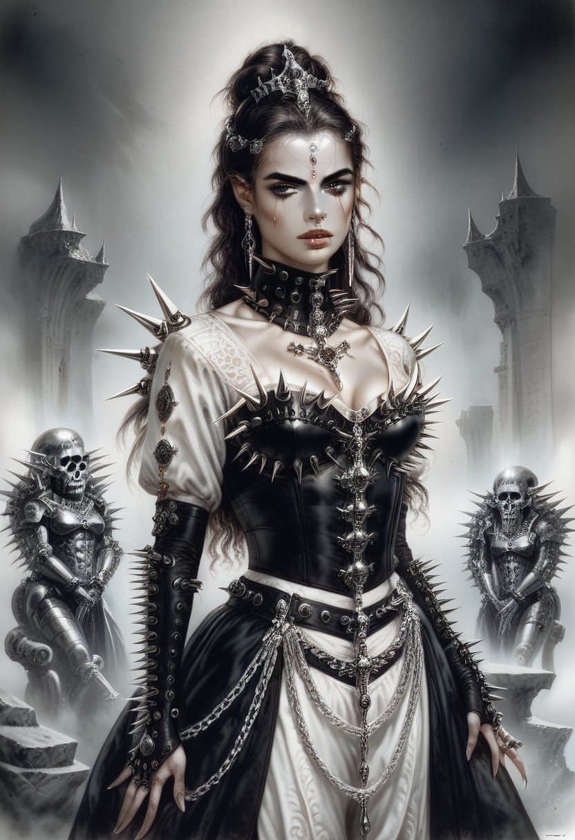 score_9, score_8_up, score_7_up, rating_safe, concept art, realistic, dark theme, low light, 1girl, solo, dvr-gs. voluminous complex hairstyle, HAROQUE2. Black leather Georgian gown dress. hud_sp1ked, chain, spikes, skirt, corset. medieval castle ballroom.