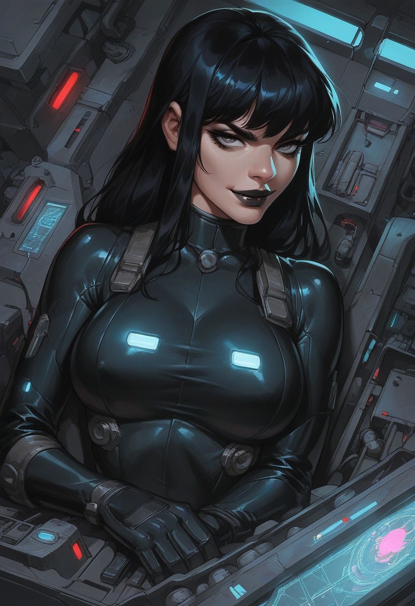 score_9, score_8_up, score_7_up, score_6_up, gundamwingcockpit, futuristic, scifi, plugsuit, transparent latex, goth, dark lips, large breasts, solo, black hair, gloves, g0thicPXL, dutch angle, smirk, controls, joystick, holographic interface, technology, close up, glowing, neon