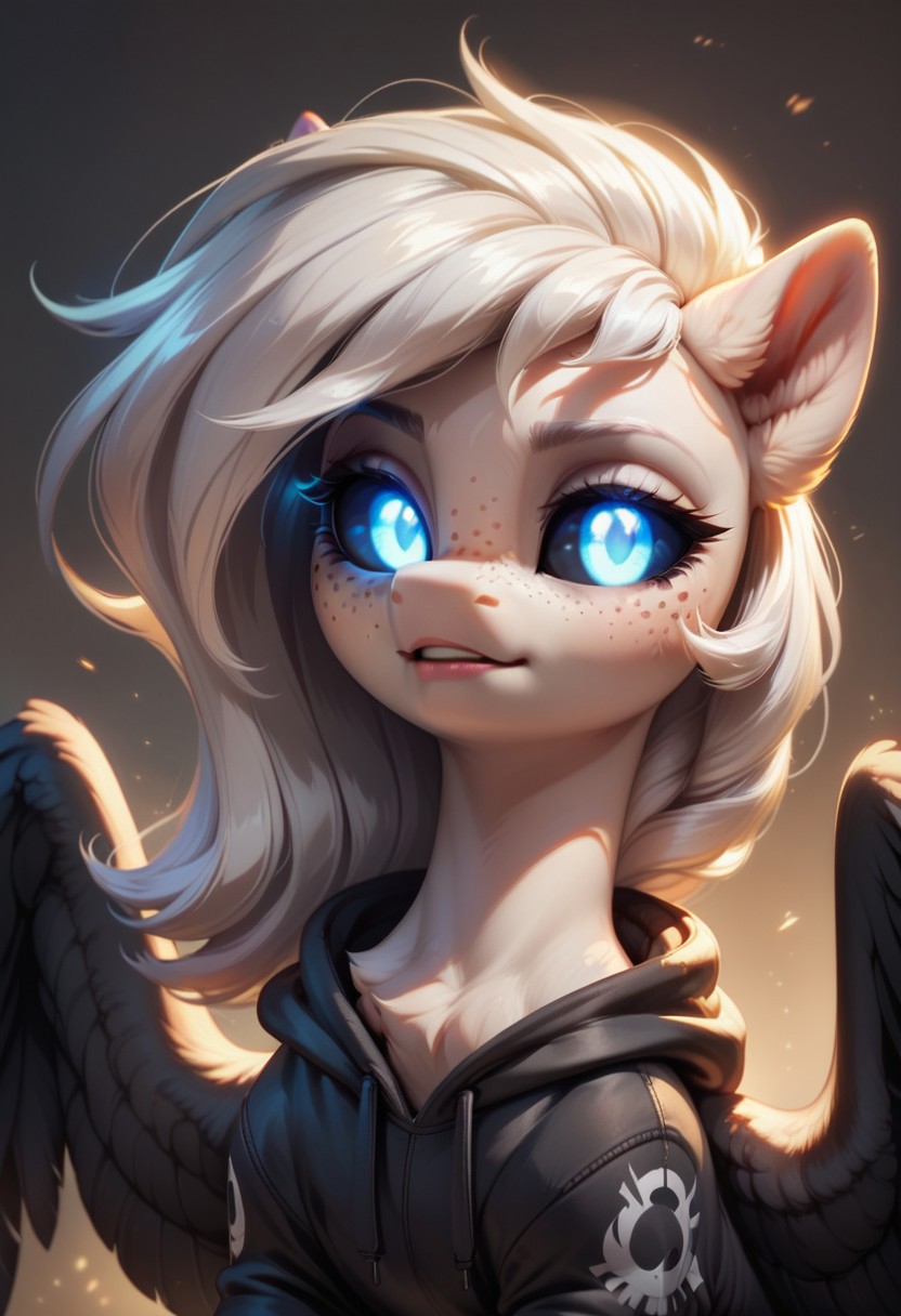 core_9, score_8_up, score_7_up, score_5_up, Albina, pony, solo, 1girl, black sclera, long hair, white hair, black wings, glowing eyes, freckles, in a hoodie, with the hood up, close-up face, hair accessories, highly detailed, vibrant colors, realistic textures, intricate details, high definition, ultra realistic textures, best rendering quality