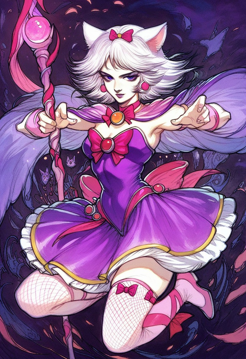 score_9, score_8_up, score_7_up, 1girl, solo, magical girl, purple dress, cosplay, cat ears, glowing staff, fishnet stockings, bow, fantasy setting, vibrant background, highly detailed, intricate design, dramatic pose