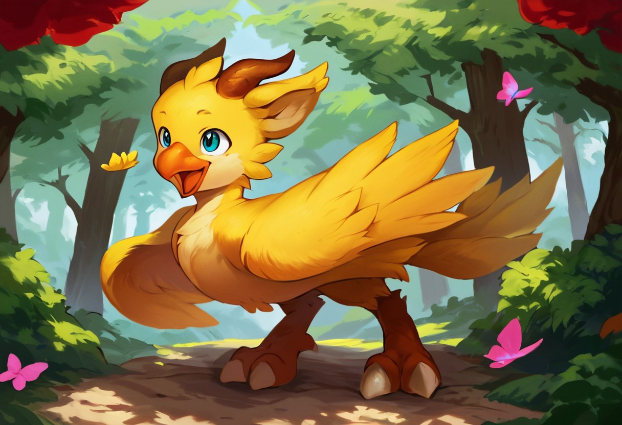 score_9, score_8_up, score_7_up, 1boy, solo, young, cute, dragon, quadrupedal, four legs, front paws, yellow feathers, orange beak, blue eyes, yellow wings, yellow tailfeathers, bird, white talons, yellow bird tail, smiling, open mouth, long tail, wings spread out, dragon horns, outdoors, forest, trees, flowers, bushes, butterflies, full body, cowboy shot,