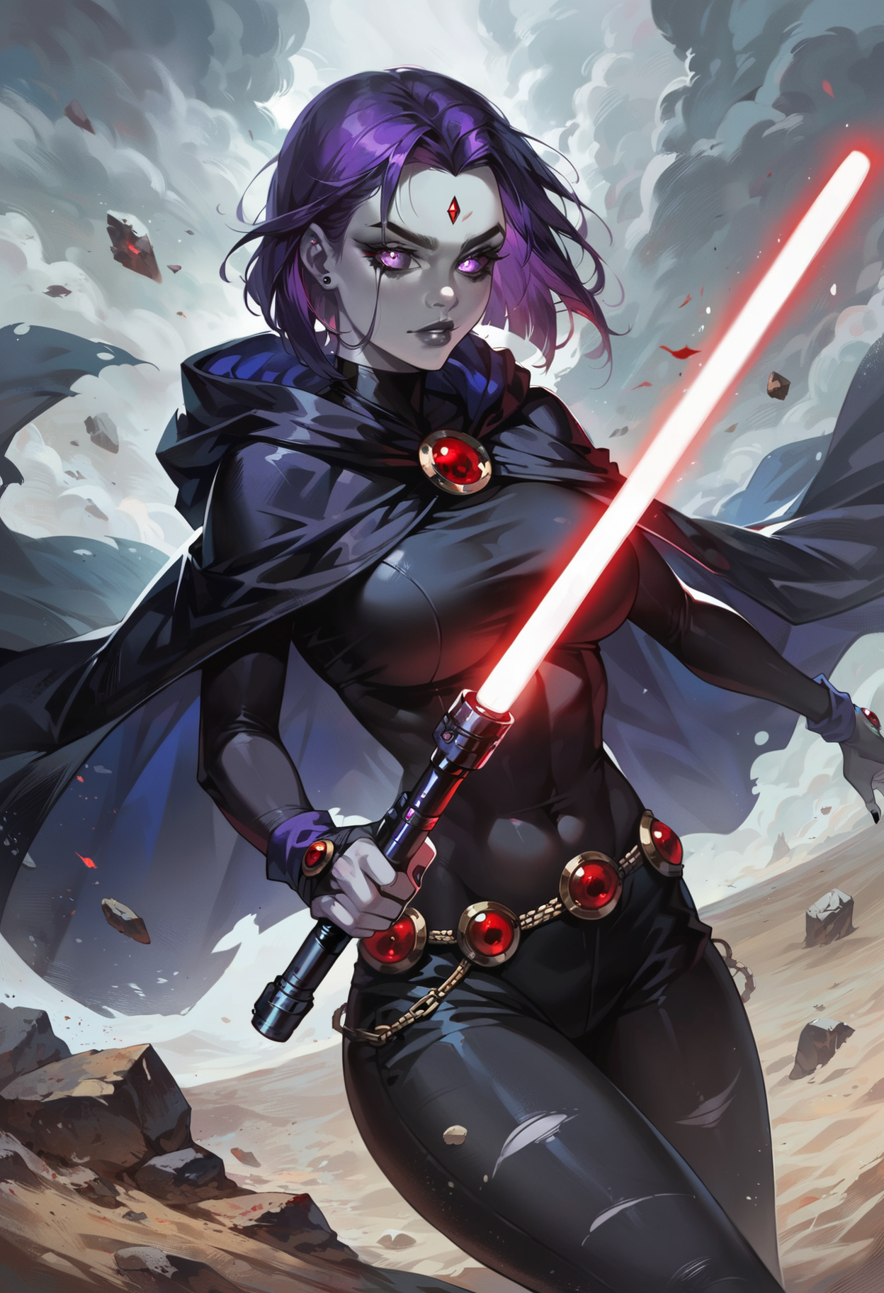 score_9,score_8_up,score_7_up, 1girl, solo, alone, raven \(titans\), (grey skin:1.5), short hair, purple hair, black sclera, purple eyes, sith outfit, sith robe, black robe, hooded robe, two lightsabers, red lightsaber, black cape, black hood, BREAK background dessert, sand<lora:XLP-Styles\Concept Art Twilight Style SDXL_LoRA_Pony Diffusion V6 XL.safetensors:0.8:0.8> <lora:XLP-Styles\RealisticAnime.safetensors:0.25:0.25>
