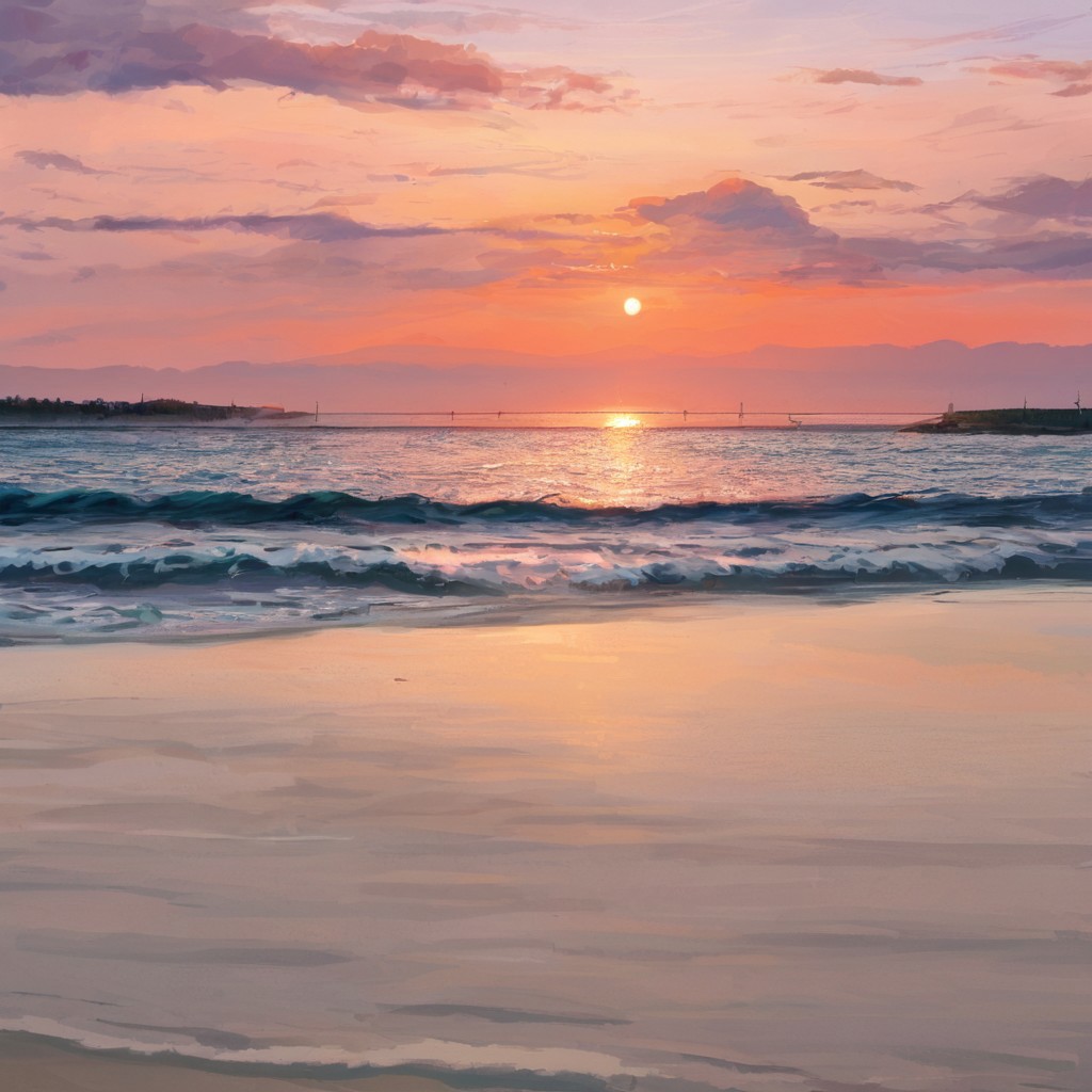 beautiful evening beach scene on the southern coast of Russia, stunning red sunset, vivid red and orange hues in the sky, soft warm light reflecting off the gentle waves, a few lush green birch trees to the side, golden sandy shore, scattered seashells glistening in the fading light, calming and serene atmosphere, soft breeze rustling through the leaves, distant seagulls flying over the horizon, small bonfire with warm glow illuminating the sand, cozy beach chairs and a surfboard leaning against a birch tree, a couple of lanterns casting soft shadows, gentle lapping of waves on the shore, romantic and inviting ambiance, painted in oil brushstrokes, highly detailed, vibrant colors, ultra-high-definition, cinematic composition, oil painting, impressionist style