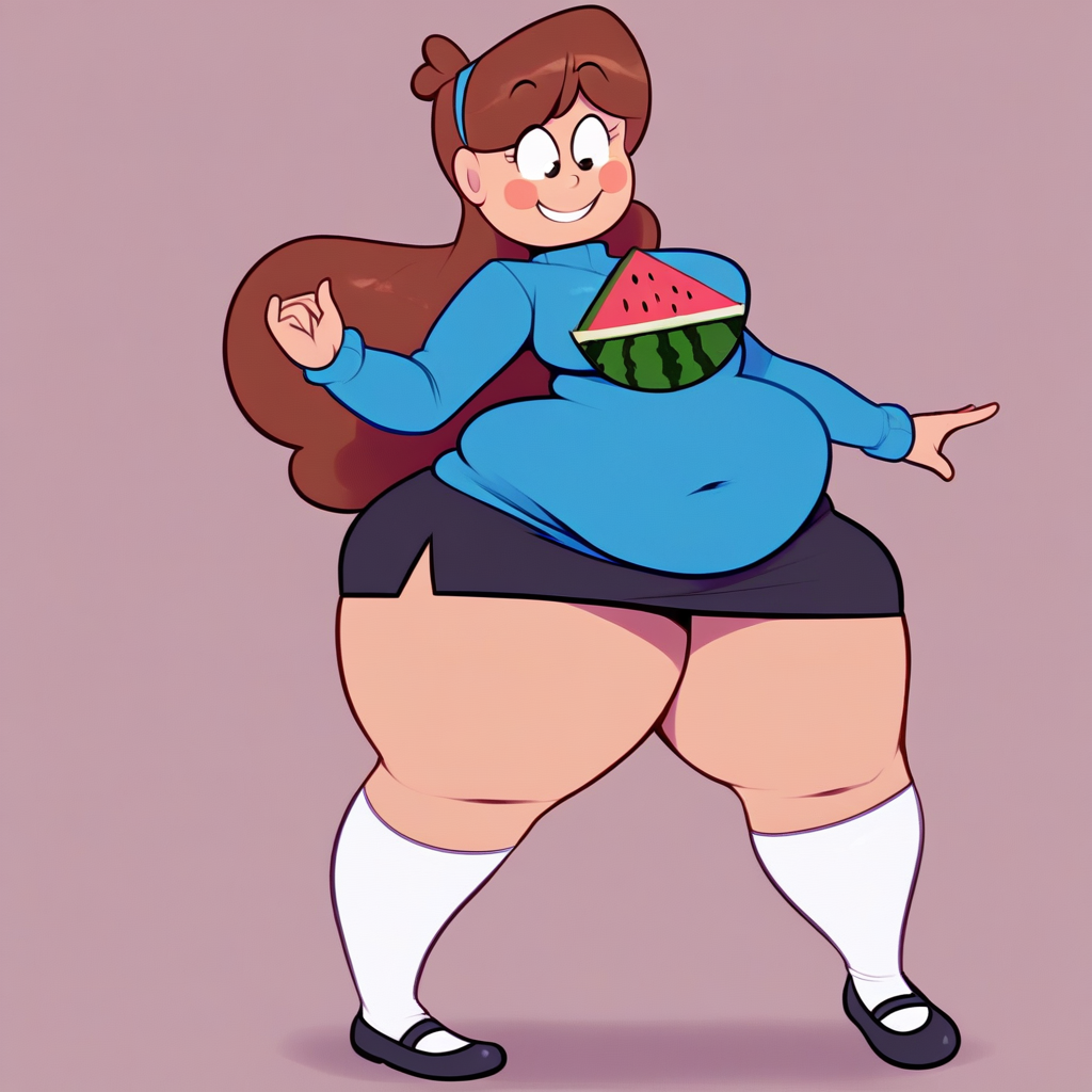 1girl, solo, score_6, mabel pines, brown hair, long hair, blue sweater, watermelon sweater, black skirt, miniskirt, white socks, mary janes, plump, chubby, navel though clothes, breasts, wide hips, thick thighs, bottom heavy, small head, blush stickers, smiling,