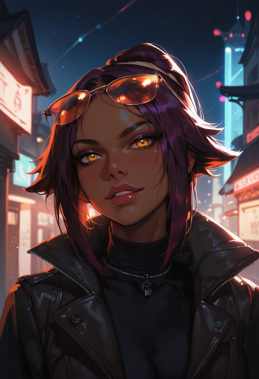 score_9, score_8_up, score_7_up, score_6_up, masterpiece, best quality, 1 female, yoruichi shihouin, dark skinned female, outdoors, night, city, ,g0thicPXL, glowing, neon, aviator sunglasses