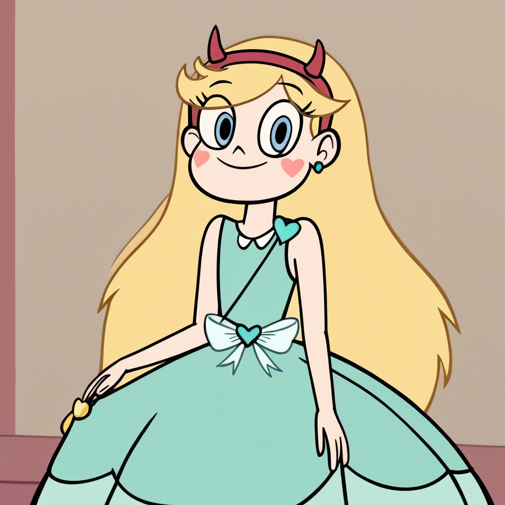 starbutterfly, 1girl, blonde hair, horned headwear, hairband, long hair, solo, heart, blue eyes, facial mark, very long hair, blush stickers, Very long large straight tulle teal princess ball gown hoop skirt, ball gown hoop skirt, teal princess dress, hoopdress, my big princess gypsy wedding dress, ballgown, a girl in a dress posing for a picture, wearing a sleeveless ballgown, looking at viewer and smiling,