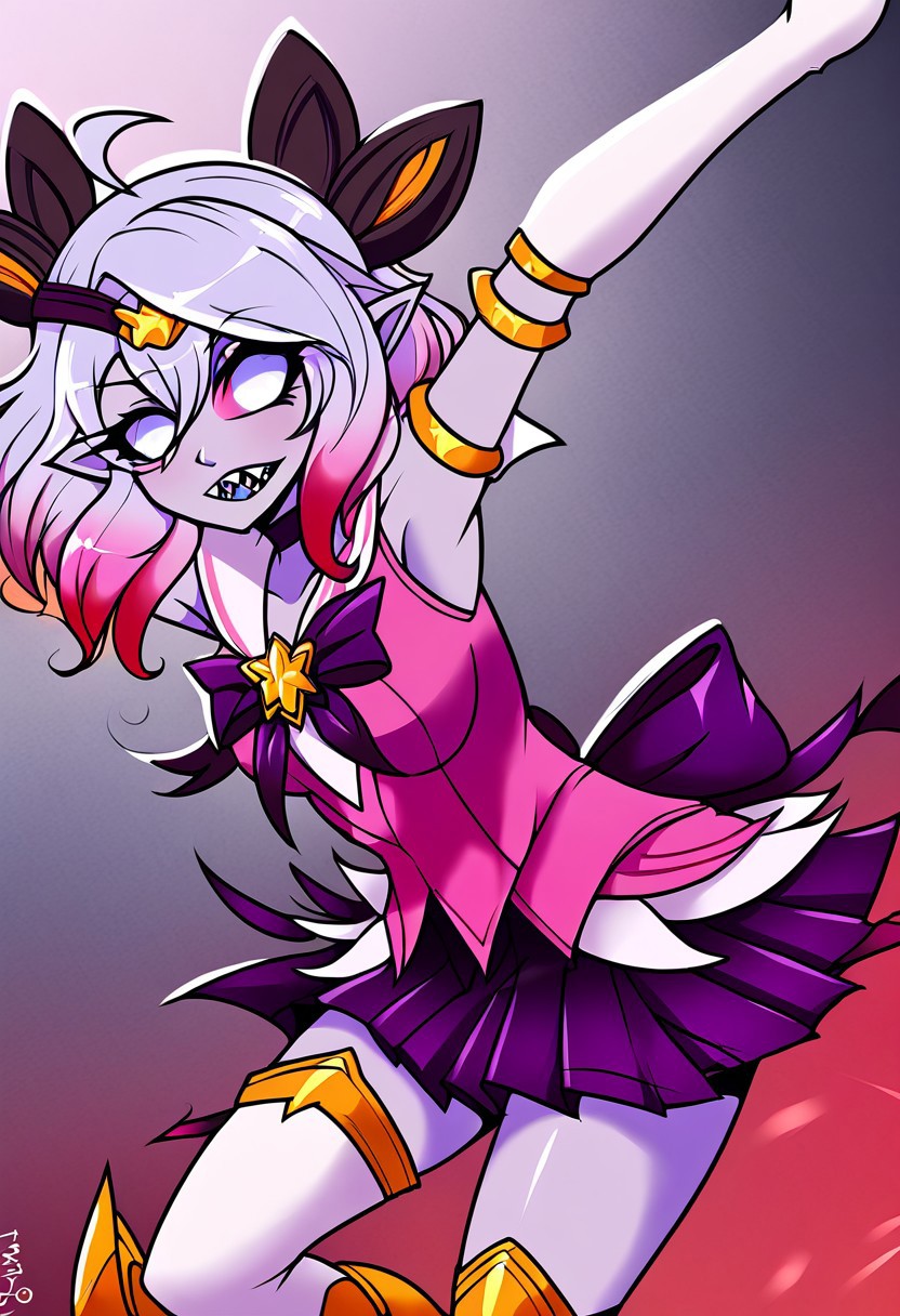 BriarLoLXL, white eyes, colored sclera, white hair, multicolored hair, gradient hair, short hair, hair between eyes, ahoge, pointy ears, sharp teeth, pale skin, grey skin, colored skin, medium breasts, twintails, hair ornament, tiara, choker, magical girl, sailor collar, pink tunic, bow, purple miniskirt, white thighhighs, white gloves, elbow gloves