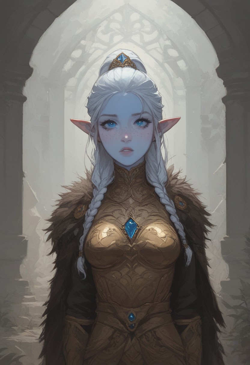 score_9, score_8_up, score_7_up, 1girl, elf, pale blue skin, blue eyes, cute face, pouty lips, freckles, long white hair, braided updo, athletic body, medium breasts, wearing armored mage robes, ivory breastplate studded with rubies, intricate design, choker, fur cape, exploring dwarven ruins