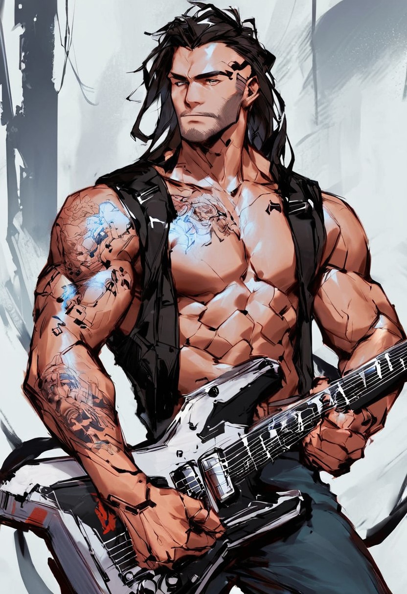 score_9, score_8_up, score_7_up, cyberpunk, male, beefcake, masculine, muscular, open vest, bare chest, holding a shotgun. electric guitar, long hair, tattoos, veins, cyberware, ArsMJStyle, AzureSketch,