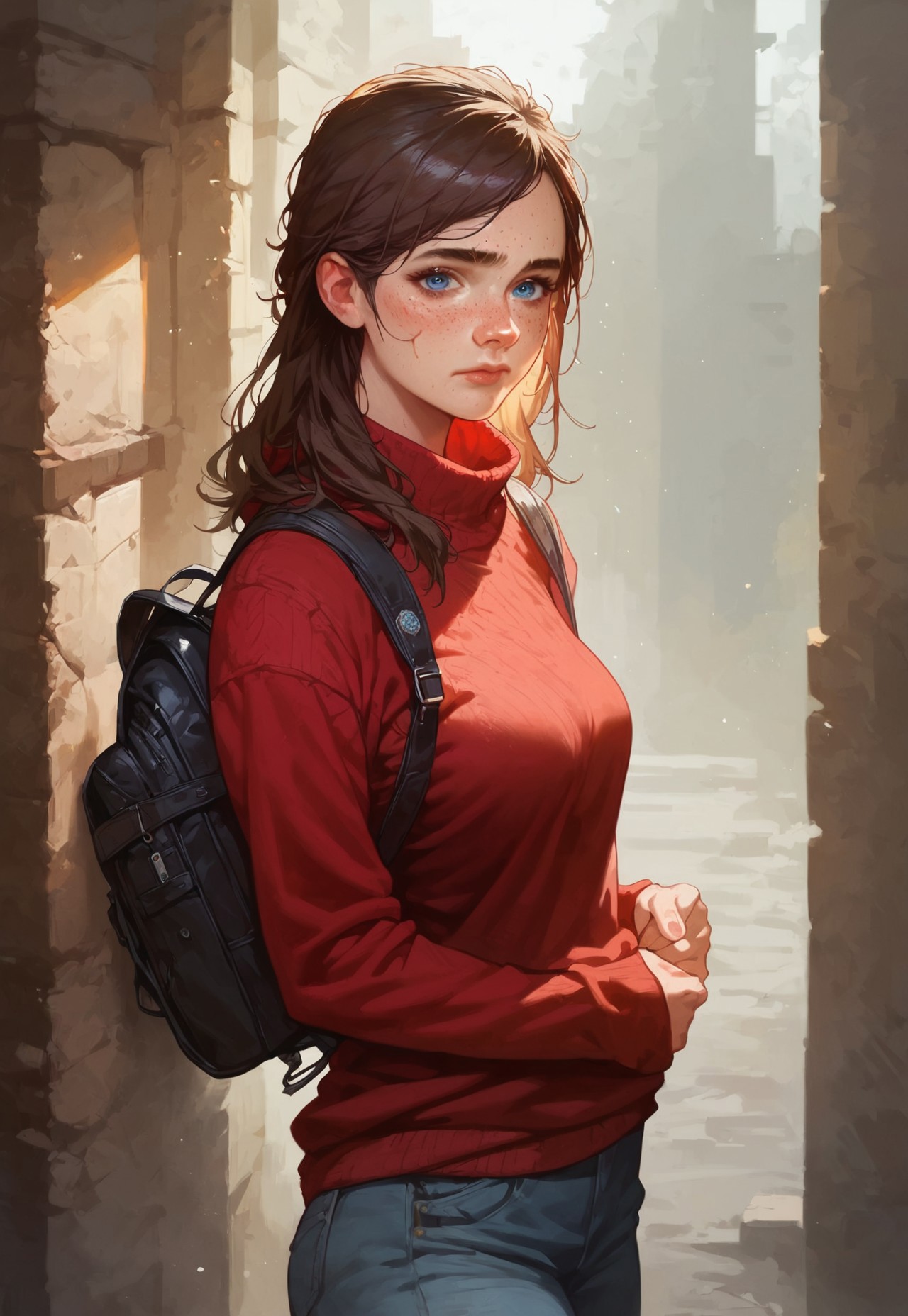 score_9, score_8_up, score_7_up, ASCII, masterpiece,ellie (the last of us), the last of us, the last of us (series), 1girl, backpack, bag, black shirt, blue eyes, brown hair, closed mouth, freckles, long hair, long sleeves, looking at viewer, red sweater, scar, shirt, solo, sweater, torn clothes