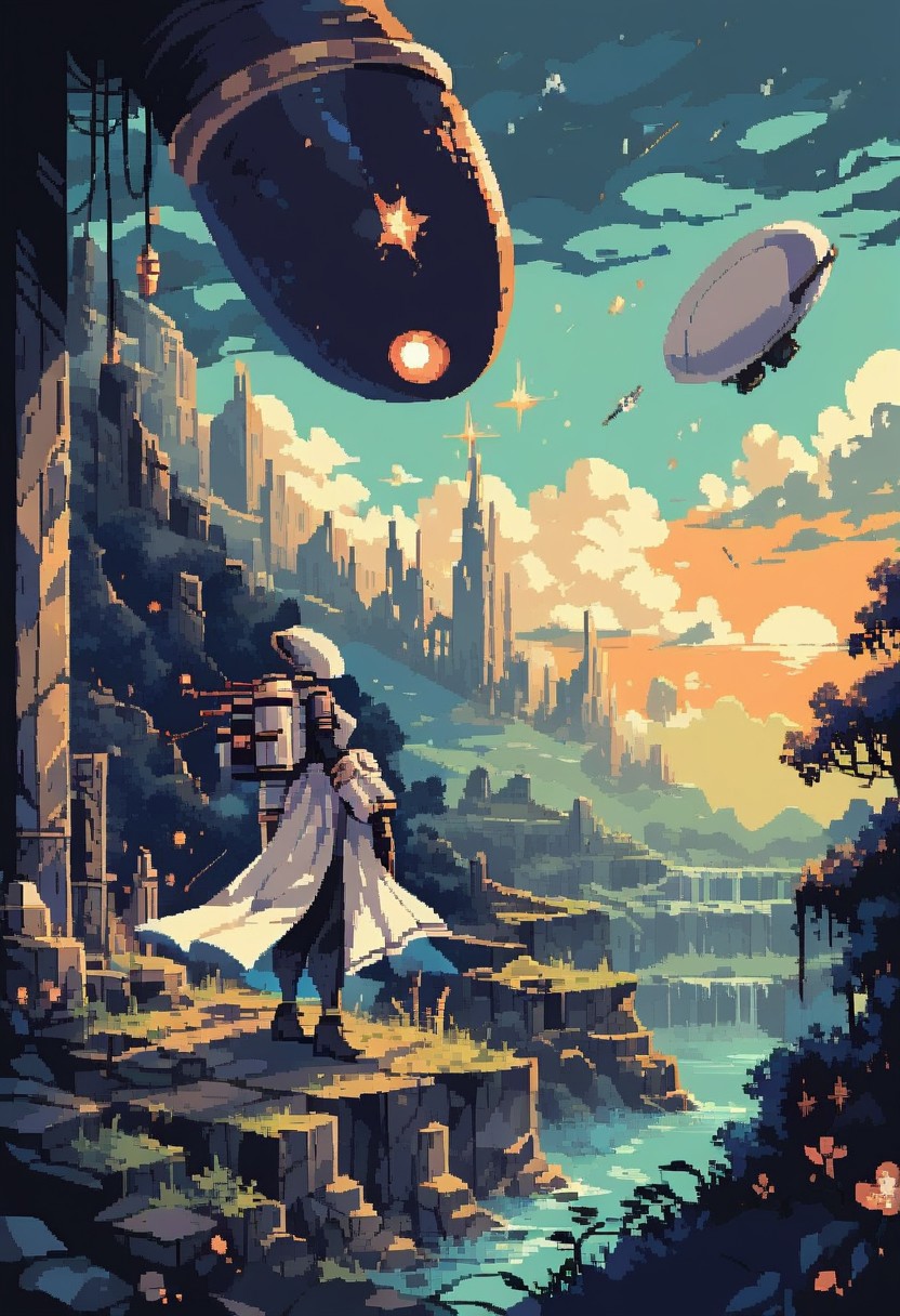 score_9, score_8_up, score_7_up, ultra quality, d3p1x3l, pixel art, scenery, solo, 1girl, Artificer Risk of Rain 2, faceless, mask, white loincloth, white helmet, white dress, white jetpack, white arm cannons, black bodysuit underneath, structure surrounded by lush green court, cosmic sky with shooting stars, floating islands, nostalgic yet futuristic style