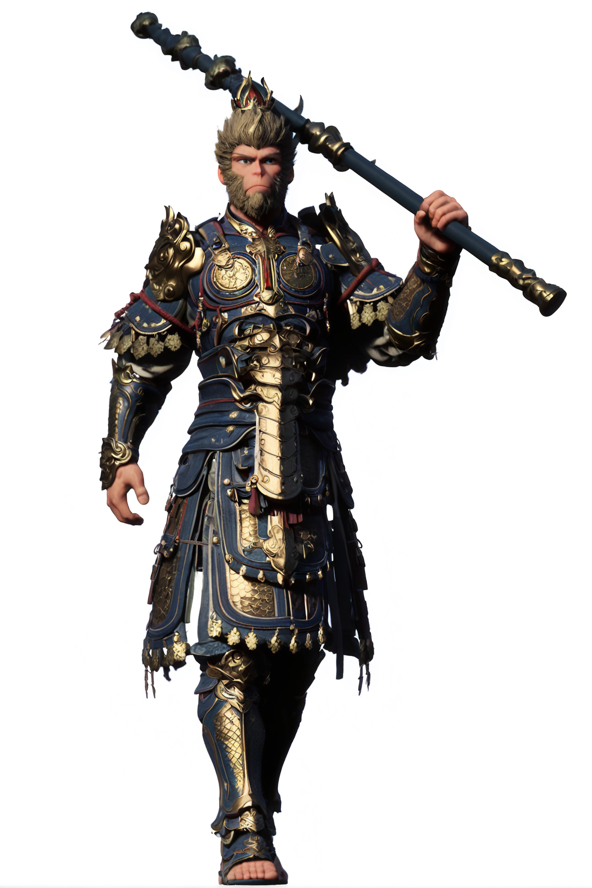 score_9, score_8_up, score_7_up, score_anime, 8k, best quality, masterpiece, (ultra-detailed), (white background,simple background:1.3), solo, hands on hip, (full body:1.1), looking at viewer, <lora:heishenhua-pony-Tanger:0.8>, eishenhua artist style, wukong, dashen, golden armor, 1boy, male focus, beard, facial hair, armor, weapon,