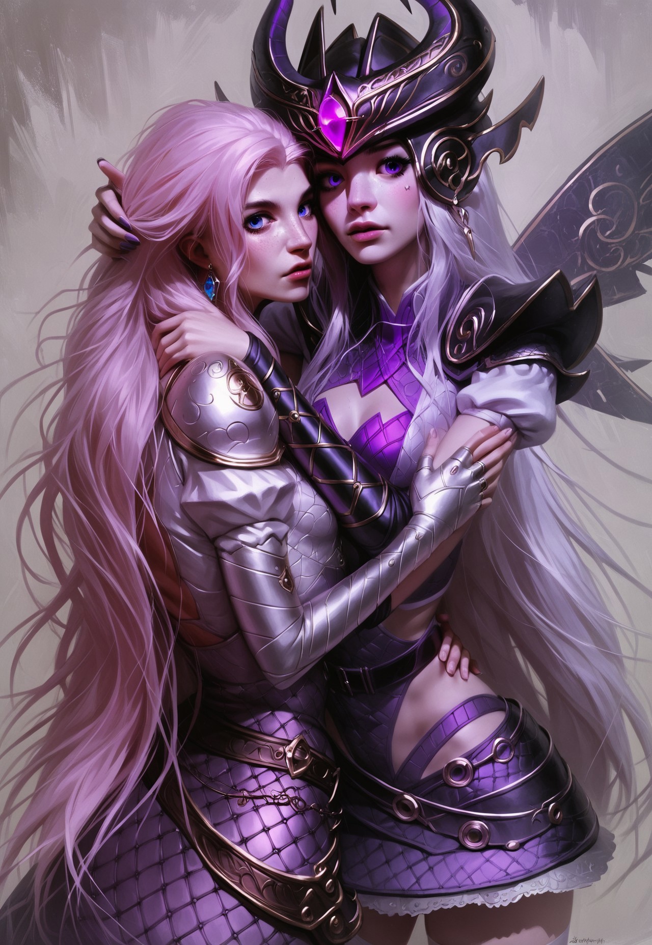 safe_pos, safe_pos, score_9, score_8_up, score_7_up, score_6_up, score_5_up, score_4_up, rating_safe, <lora:XSFQT_XLV03:0.5> XSFQT, <lora:R0y41_RealXL_V00:0.5> R0y41, 2 girls, standing, hugging, kissing, Syndra and Seraphine,, looking at viewer, realistic looking, raw photo, photorealistic, <lora:extremely_detailed:1> extremely detailed, upper body, looking at viewer, girl 1: SeraphineLoLXL, blue eyes, pink hair, bangs, hair ornament, very long hair, shiny hair, star (symbol), earrings, medium breasts, choker, white jacket, puffy short sleeves, purple dress, wings, white gloves, skirt, belt, white thighhighs, brown boots BREAK girl 2: SyndraNormal, 1woman, solo, witch_outfit, crown, purple eyes, bare_feets, long_stocking, dark_sphere