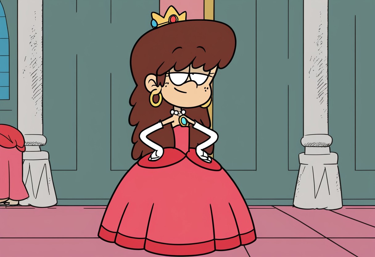 1girl, solo, Lynn Loud, brown hair, loose hair, long hair, black eyes, princess make up, Very long large floor length wide straight tulle red ball gown hoop skirt, ball gown hoop skirt, red princess dress, hoopdress, white pearl necklace, long elbow length princess gloves, my big princess gypsy wedding dress, ballgown, a girl in a dress posing like a princess for a picture, looking at viewer, pretty eyes, she is posing, hands on hips, closed mouth, half closed eyes