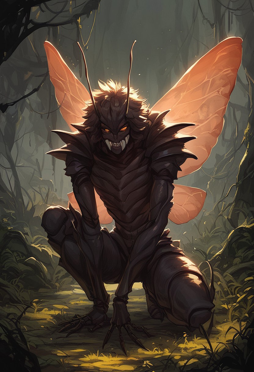 solo, score_9, score_8_up, score_7_up, score_6_up, m4g, Expressiveh, sc3n3ry, <lora:Uglystyle11a:-1>, dynamic lighting, detailed, absurdres, BREAK, humanoid mosquito, segmented insect-like body, large compound eyes, elongated proboscis, sharp mandibles, thin arms with clawed fingers, spindly legs with jointed segments, translucent wings with intricate veining, wasp-like stinger at the rear, BREAK, crouching low, ready to strike, wings slightly spread, proboscis aimed forward, BREAK, standing in a dense, foggy swamp, surrounded by murky water and twisted trees, eerie and unsettling atmosphere