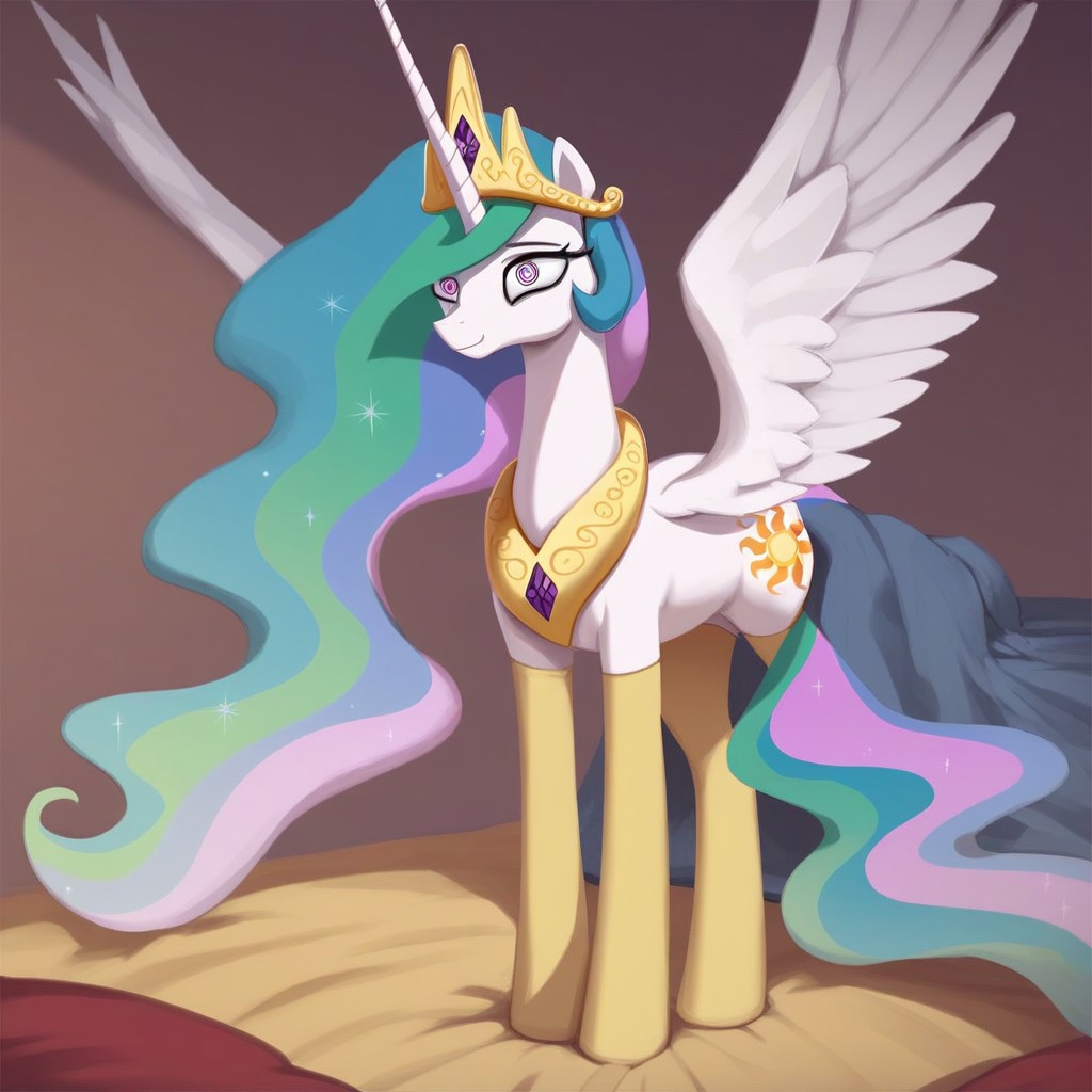 (Princess Celestia, alicorn, woman, sweet face, dead eyes, wears yellow stockings,,bed, blanket thrown over her, we see her in full height, she stands with her back arched) Score_9, Score_8_up, Score_7_up, Score_6_up, Score_5_up, Score_4_up, , high quality, , solo