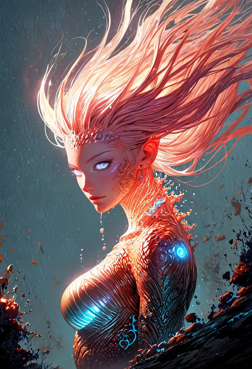 (score_9, score_8_up), score_7_up, zPDXL, solo, <lora:MythAnim3Style:0.8>, MythAn1m3, source_anime, 1girl, mermaid, dark mysterious backgroud, Iridescent eyes, aquatic scene, dreamlike atmosphere, mystical, ethereal light, detailed textures, whimsical, rippling, dripping, water element, very long cascading hair, water, very beautiful, sexy, sexy body, beautiful body, scales, wet body, Iridescent scales, bubbles, water drops, Iridescent skin, multi colored eyes, partially underwater shot, watce, bioluminescent skin, bioluminescent, glowing, bioluminescent scales, bioluminescent hair, FastNegativeV2, laser light clothes, submerged breast, water line on lense, view from under water, light hair