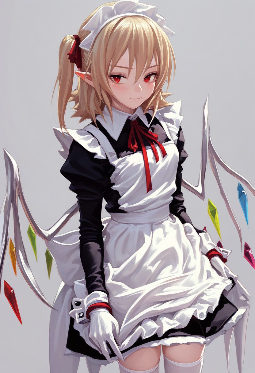 score_9,score_8_up, score_7_up,fkey, 1girl, solo, looking at viewer, blush, smile, bangs, blonde hair, simple background, red eyes, thighhighs, gloves, long sleeves, dress, ribbon, hair between eyes, closed mouth, standing, cowboy shot, frills, wings, alternate costume, pointy ears, puffy sleeves, white gloves, grey background, apron, black dress, white thighhighs, red ribbon, zettai ryouiki, wrist cuffs, maid, maid headdress, neck ribbon, one side up, juliet sleeves, waist apron, white apron, maid apron, crystal, enmaided, flandre scarlet