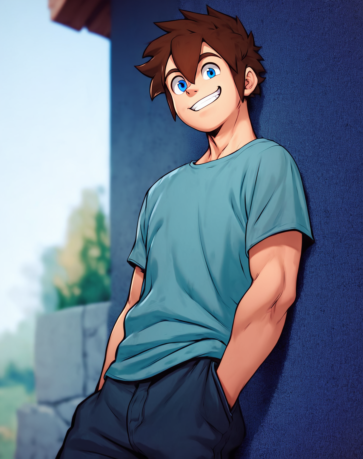 score_9, score_8_up, score_7_up, smooth lines, 2d, countershading, soft shading, extreme detail, 4K, high definition, high resolution, <lora:Adler:0.8>, 1boy, adler, solo, brown hair, blue eyes, shirt, pants, outdoors, looking at viewer, happy, grin,