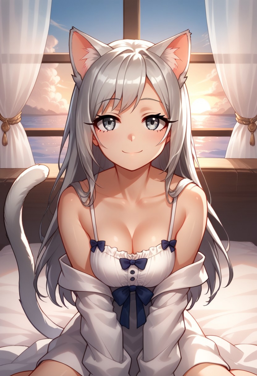score_9, score_8_up, score_7_up, ((high_quality)), ((Super_Detailed)), Low-key lighting, dark, source anime, 1girl, solo, inside a beautiful bedroom, sunrise, cute silver tabby cat girl has silver tabby ears, long silver tabby cat tail, very long messy black hair, small silver streaks, (longhair:1.3), (((silver eyes))), cute silver tabby cat girl is wearing a white Gothic dress, sitting in bed, neutral, smile, tilting head, curious, question, looking up at viewer, from above, blushing, perfect hand, beautiful bedroom in background, my hero academia style, (((very long messy black hair, small silver streaks))) (((sunrise)))