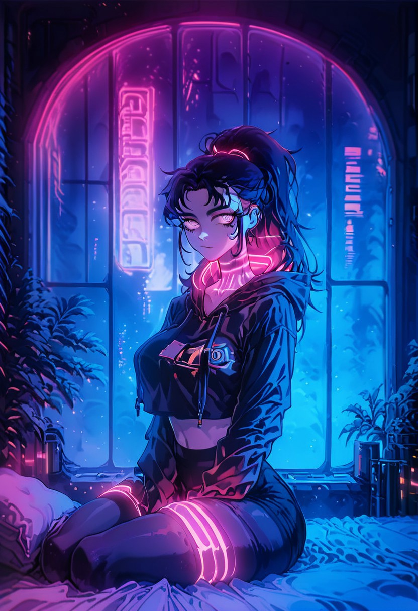 score_9,score_8_up,score_7_up,score_6_up, 1girl, sitting in bed next to a large window, hands between thighs, wearing croptop hoodie, black croptop hoodie, long hair, black hair, blue strip in hair low ponytail hairstyle, pink eyes, <lora:DetailedEyes_V3:1> <lora:add_detail:1>, pov from the side, sitting on the bed, hoodie, plants on the windowsill, looking out the window, looking away from viewer, background through window is vast space, galaxy background, wearing tights, leggings, black tights, thighs, night time, cyberpunk city view out of the window, neon light, purple neon lights, raining outside, heaving rain outside, girl is dry, no rain inside