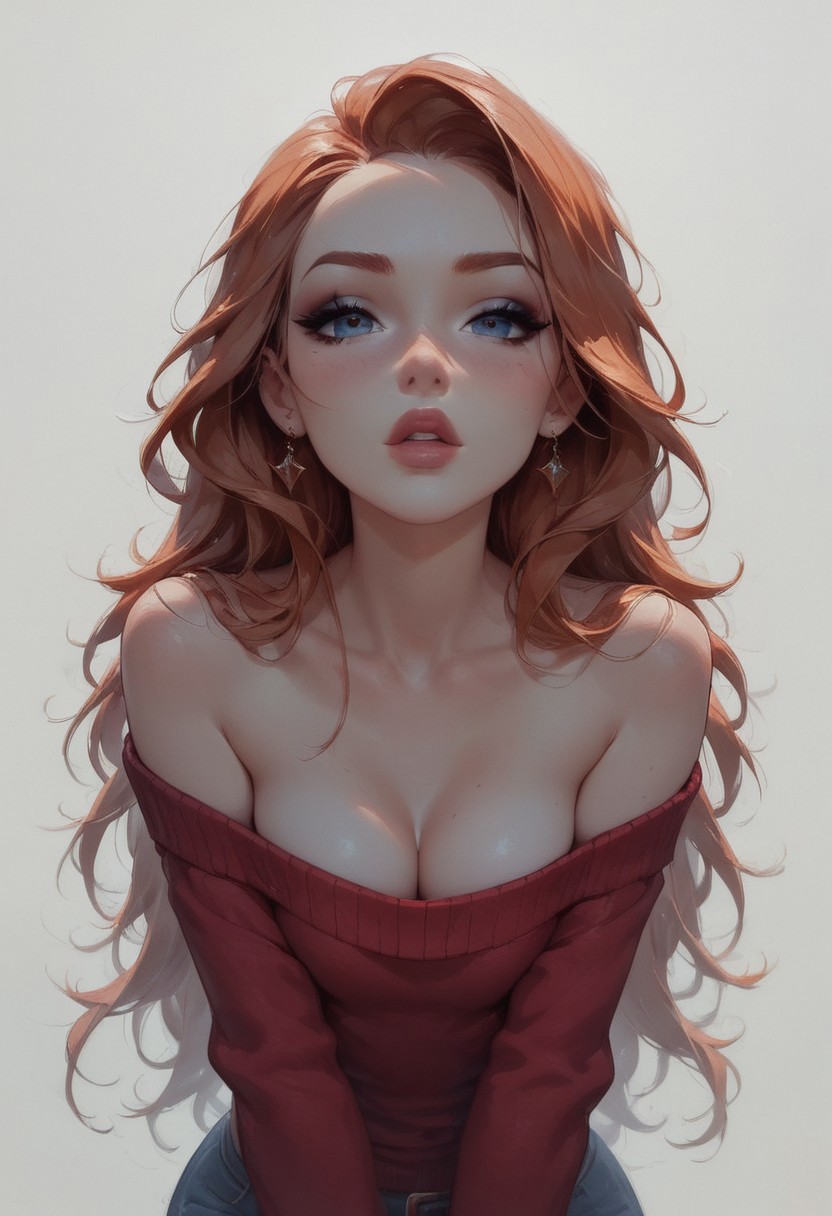 score_9, score_8_up, score_7_up, ginger girl, character concept art of a beautiful woman leaning over, red sweater falling off her shoulder, cleavage, extremely sexy, seductive, long hair, luscious lips, comic book art, rough colored sketch, (small breasts, big hips, looking at the viewer), (simple background, white background)