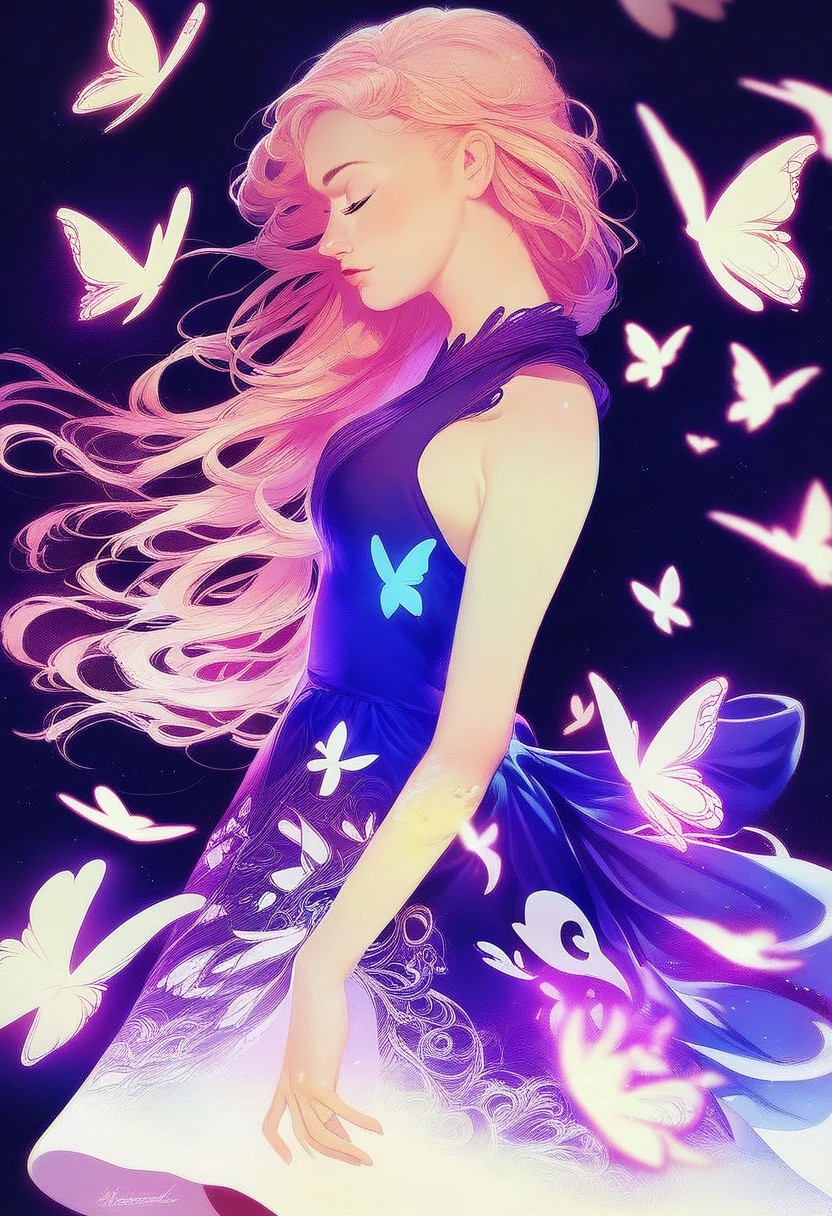 realistic, score_9, score_8_up, score_7_up, score_7, score_6_up, score_5_up, reij-artgrafneonsplash, purple neon glow, soft shadows ,(black background:1.2), black ground, dress, inked landscape patterns, calligraphy, inkstyle, fairies swirling around, butterflies, volumetric lighting, night time, sea of lowers, moonlight black background, side view, long hair