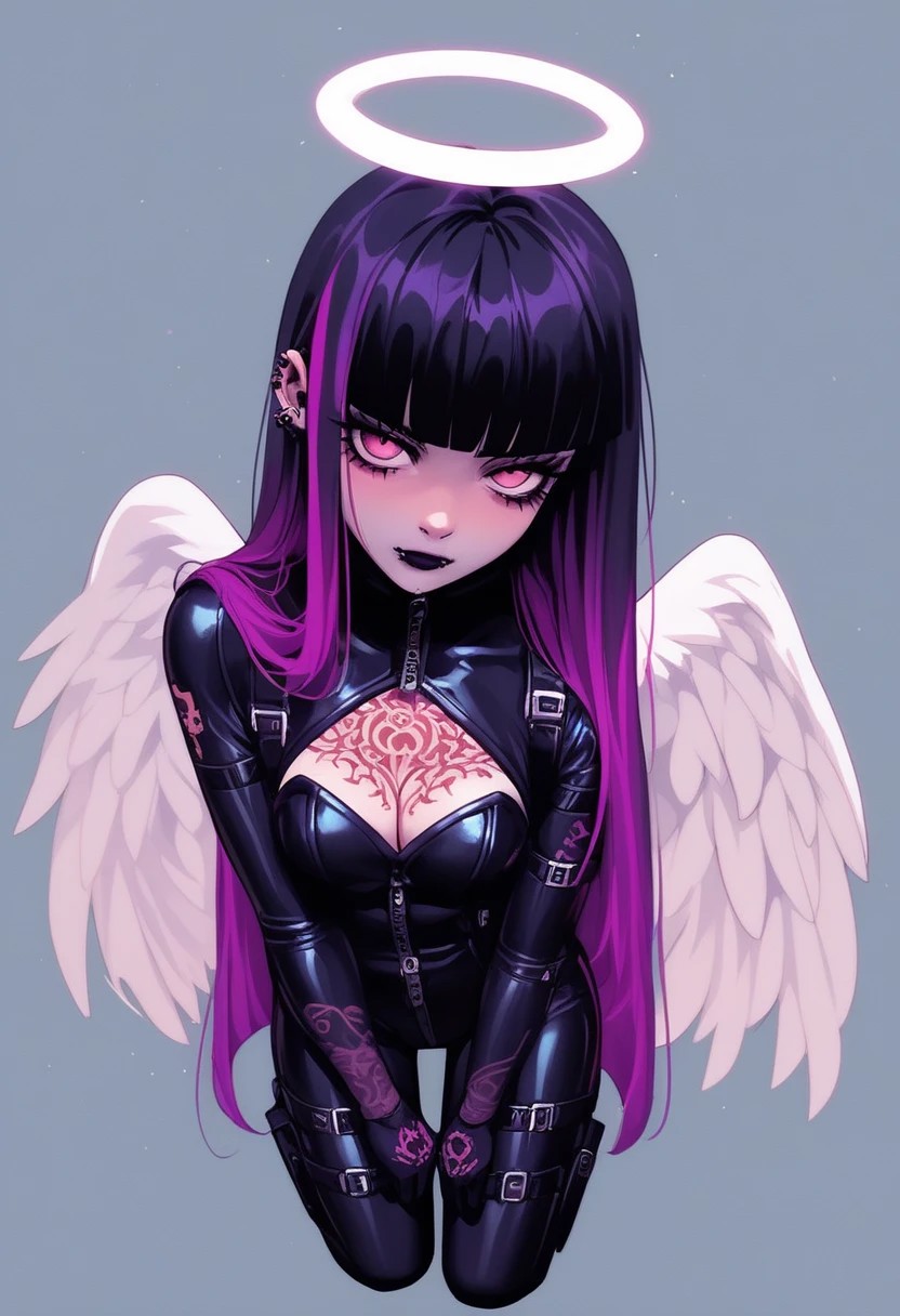 score_9, score_8_up, score_7_up, score_6_up, score_5_up, source_anime, cleavage, pants,plugsuit, from_above, looking_up, kuudere,angel,(chain:0.5),plaid,pastel_goth,teal,inverted colors, violet hime_cut, <lora:Body Tattoo Pony_alpha1.0_rank4_noxattn_last:0.8>, , <lora:MJ52_v2.0:0.8>, , <lora:egirlXLP:0.7>, egirl, 1girl, solo, 2d