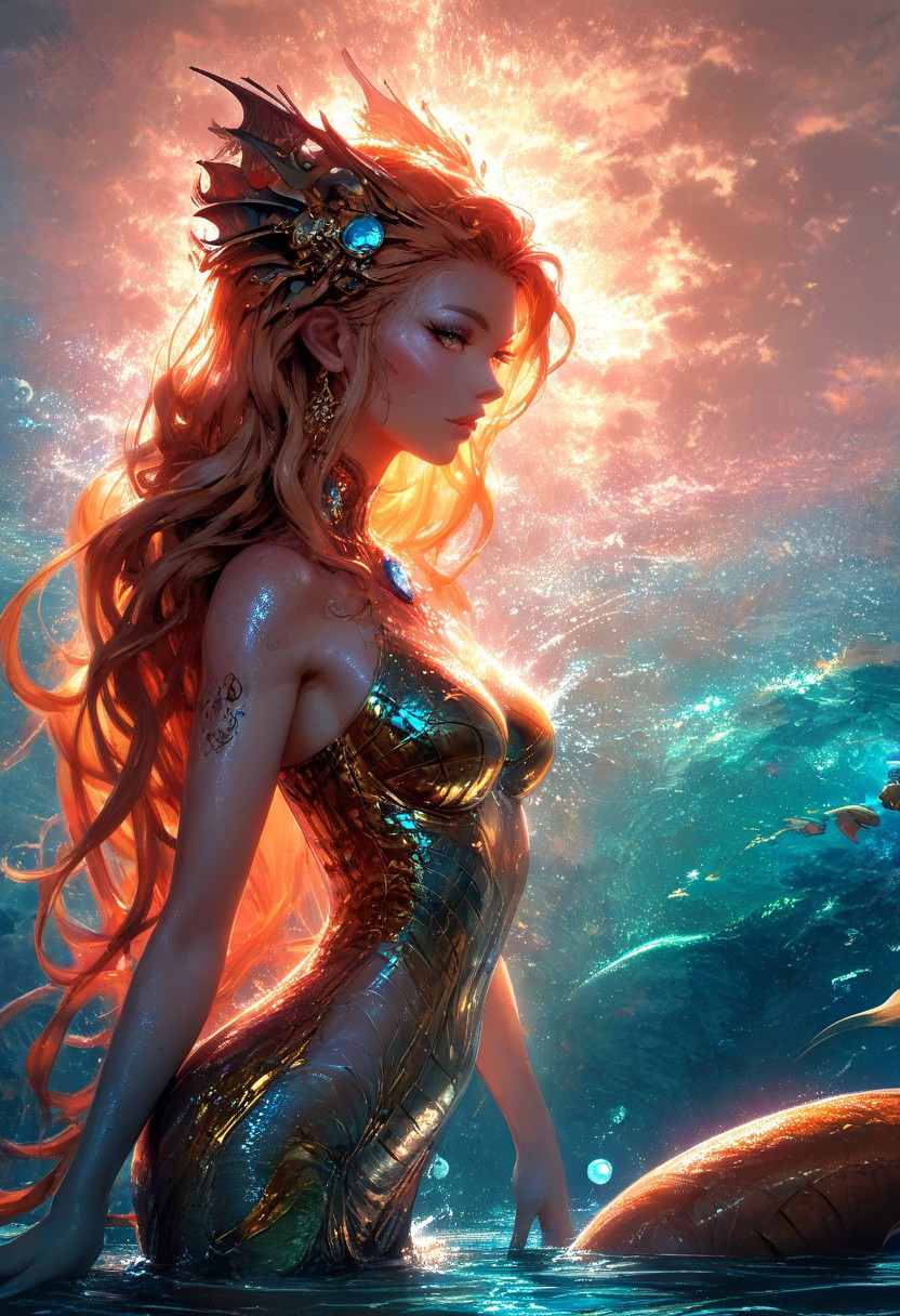 (score_9, score_8_up), score_7_up, zPDXL, solo, zPDXL3, <lora:MythAnim3Style:0.8>, MythAn1m3, character, source_anime, 1girl, mermaid, Iridescent eyes, aquatic scene, dreamlike atmosphere, mystical, ethereal light, detailed textures, whimsical, rippling, dripping, water element, very long cascading hair, water, very beautiful, sexy, sexy body, beautiful body, scales, wet body, Iridescent scales, bubbles, water drops, Iridescent skin, multi colored eyes, partially underwater shot, bioluminescent skin, bioluminescent, glowing, bioluminescent scales, bioluminescent hair, bioluminescent scales, FastNegativeV2, laser light clothes, submerged breast, water line on lense, view from under water, waterline, great lighting, seashells details, metallic details, hair ornaments, gems, sunset, bioluminescent tattoos, coastal landscape background, long hair braids, wet transparent clothing, translucent clothing, bodysuit with flowing sleeves, orange hair