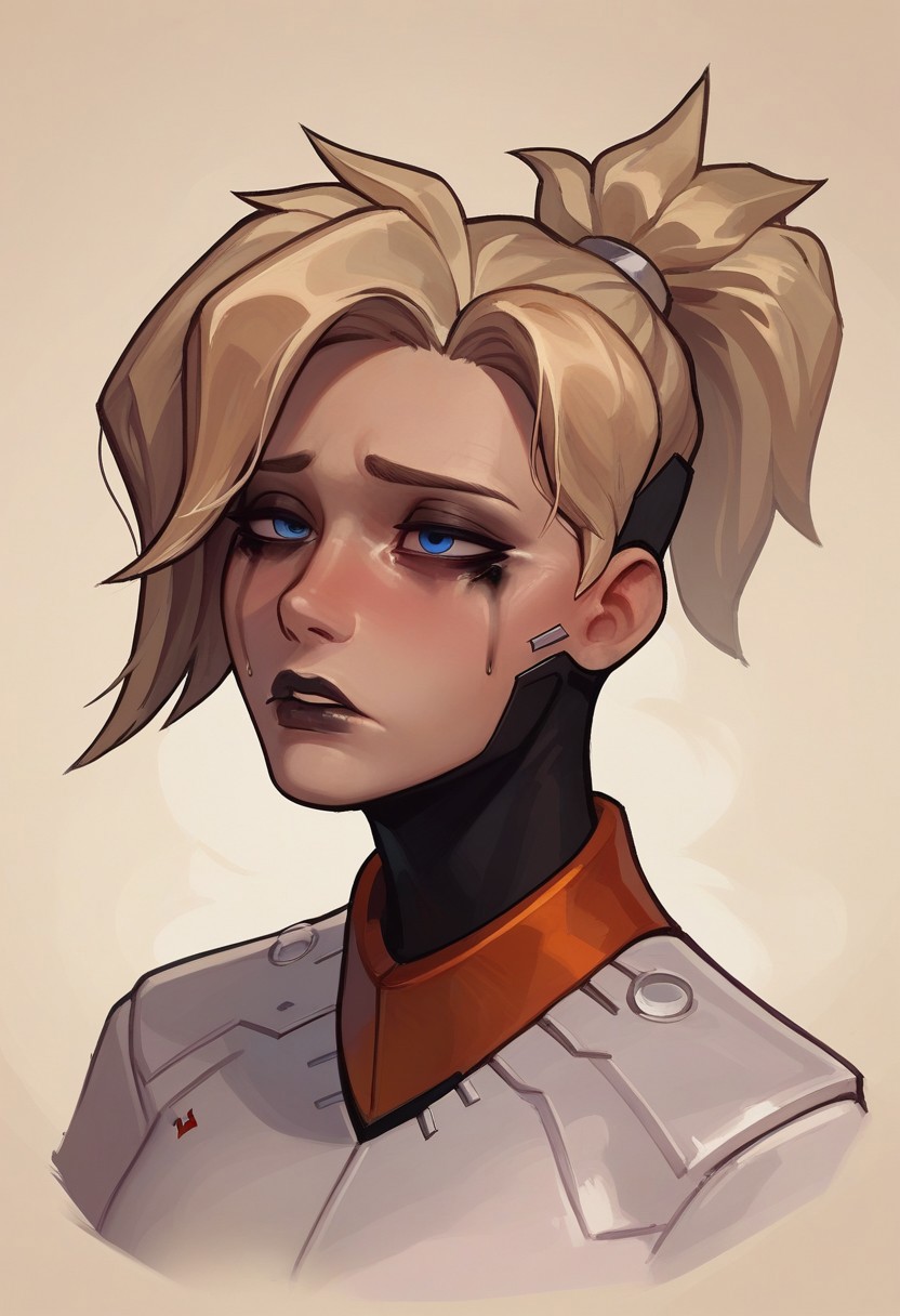 (score_9, score_8_up, score_7_up, score_6_up, score_5_up, score_4_up) 1girl, Mercy from Overwatch, blonde hair, high ponytail, mascara tears, ruined makeup, blue eyes, black lipstick, black eyeshadow, sexy, hot, fit body, sweet ass, perfect ass, dull eyes, lifeless eyes, sad eyes, pale skin, bags under eyes, emotionless expression,