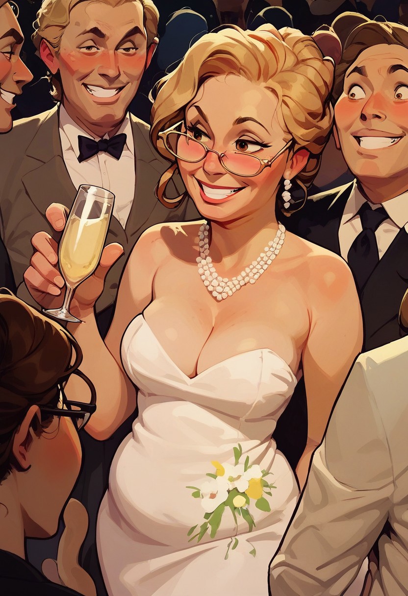 BLONBUNMAT, score_9, score_8_up, score_7_up, score_6_up, classy mature woman, blonde hair, brown eyes, glasses, medium breast, black party dress, sleeveless, ((cleavage)), sexy, teasing, grin smile, elegant party, hold a glass of champagne, crowd in background