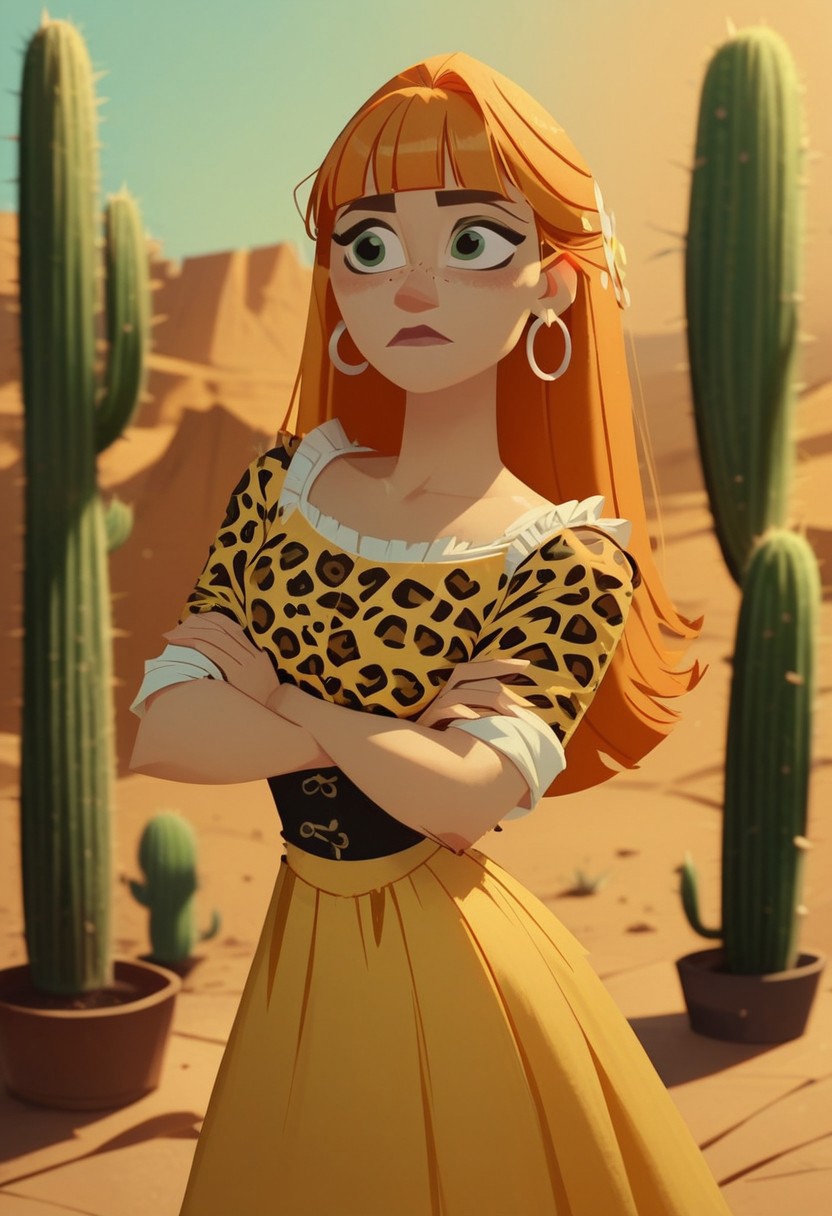 score_8_up, score_7_up, tangledadventure, 1girl, a woman in a leopard print top and a frilly yellow skirt, arms crossed, standing in a desert, Ginger hair with blunt bangs, hoop earrings, cactus