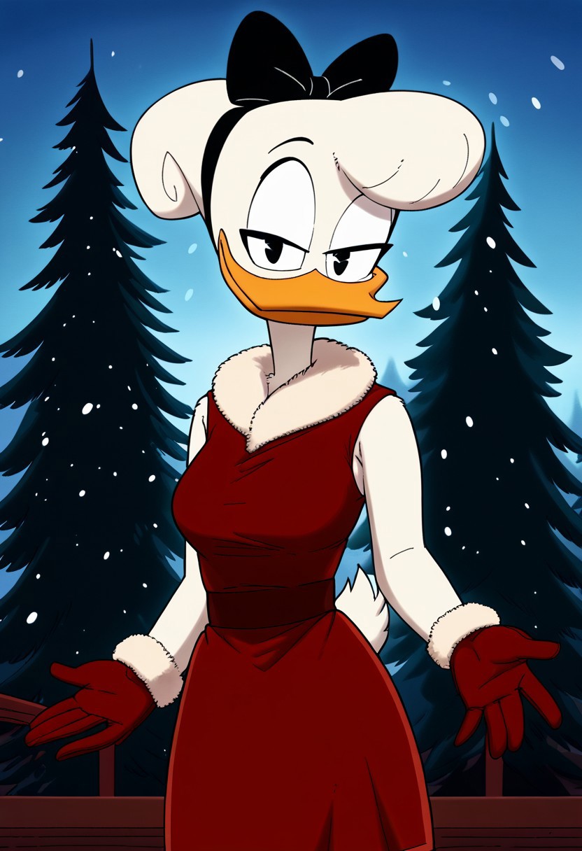 score_9, score_8_up, score_7_up, score_6_up, best quality, highres, source_furry, masterpiece, BREAK ppp BREAK female, daisy, duck, beak, white skin, white body, white hair, black eyes, breasts, hair bun, centered hair bow,1girl, gloves, furry female, furry, dress, solo, smile, red dress, snow, outdoors,black eyes, fur-trimmed dress, fur-trimmed gloves, snowing, fur trim, breasts, christmas, standing, medium breasts, sleeveless, looking at viewer, tree, sleeveless dress, red gloves, half-closed eyes, happy, closed mouth, pine tree, orange dress <lora:Drockdraw_Style:0.7> <lora:Daisy_Duck3:0.9>